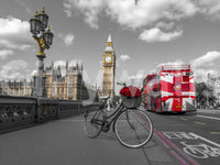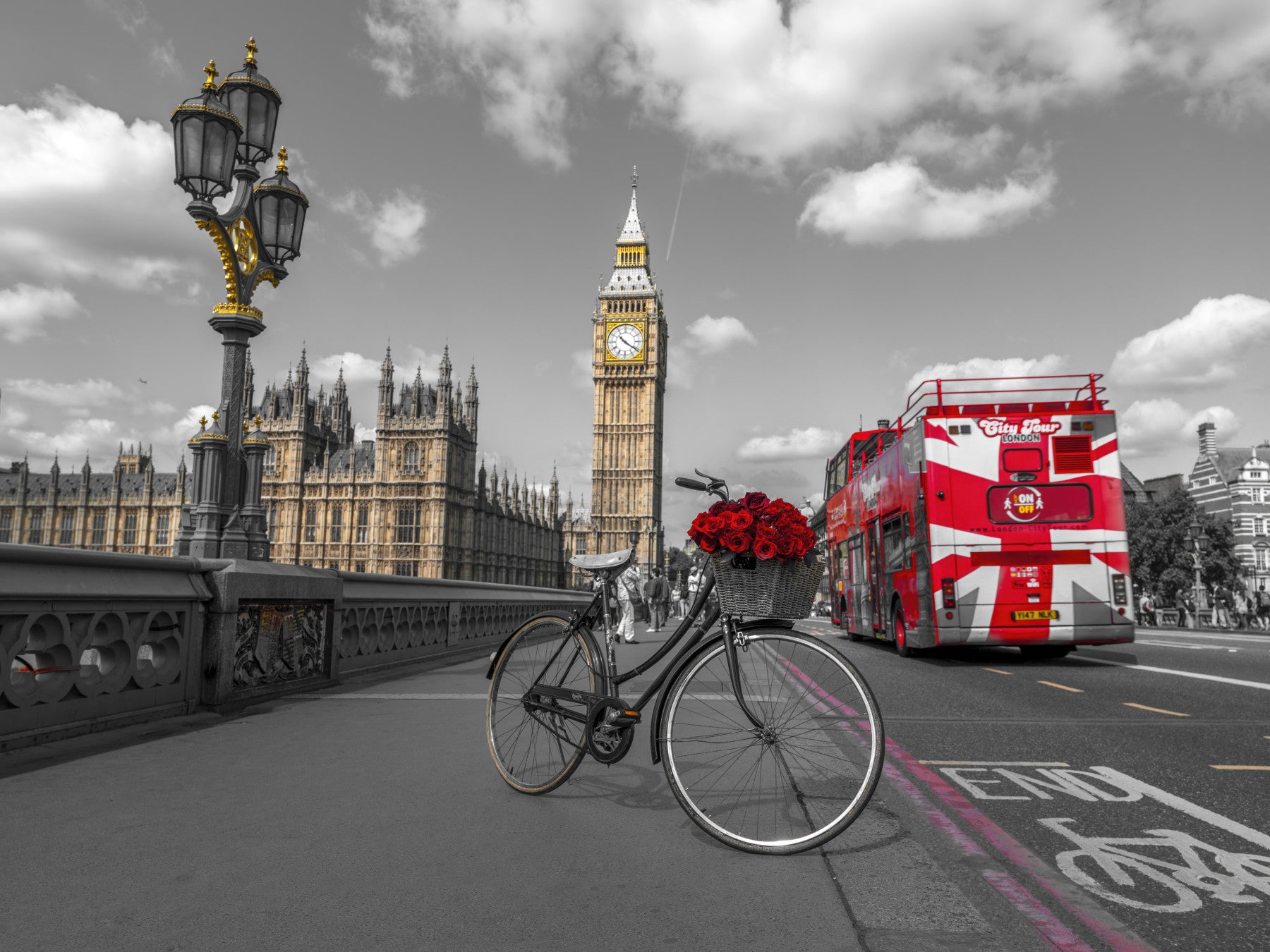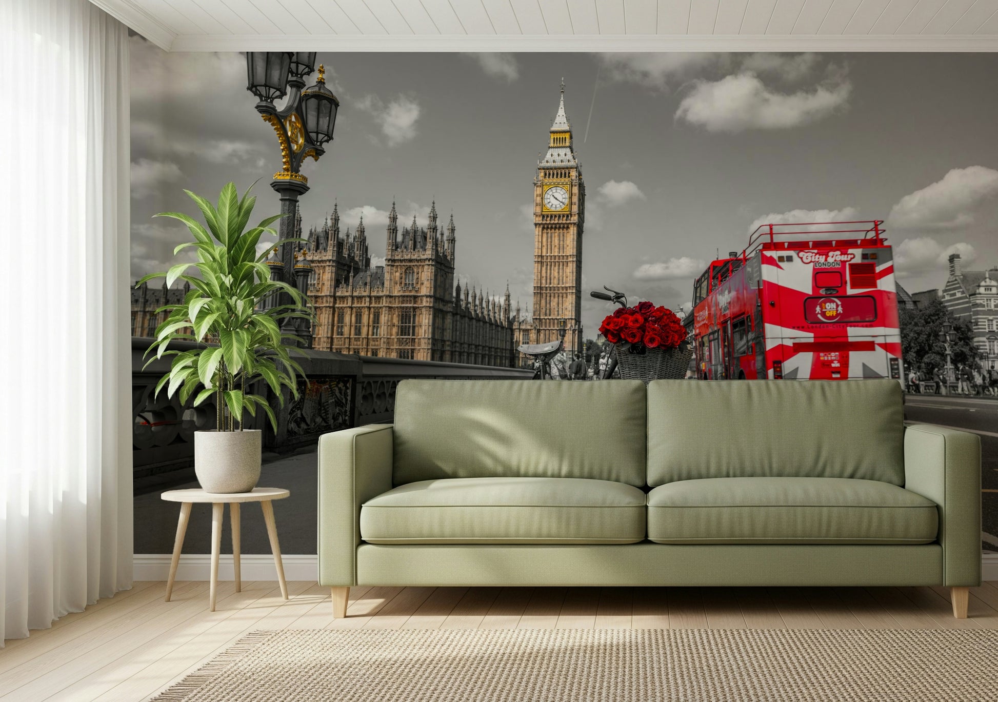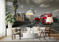 Bicycle with bunch of flowers on Westminster Bridge, London, UK. Infuse your home with a touch of British elegance using this memorable wallpaper for walls. A bicycle with a basket full of vibrant roses stands before iconic London sights, offering a unique visual experience. The design balances vintage charm with modern appeal through its greyscale base and striking red highlights. Consider it for studies, lounges, or even kitchens to add a stylish focal point. This wallpaper brings the energy of London into your personal space, creating a sense of travel and timeless style.