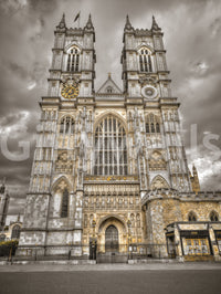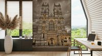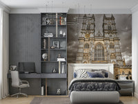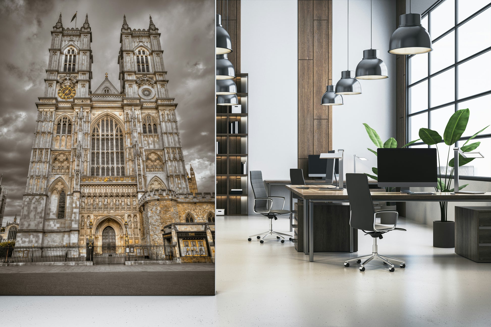 Famous Westminster Abbey in London, UK. Transform your walls with the grandeur of Westminster Abbey. This architectural wallpaper for walls showcases intricate Gothic details and a muted colour palette, bringing historic charm to any room. Gold accents highlight the building's ornate features, adding a touch of regal elegance. Install it in a living room to create a sophisticated statement or in a home office for a distinguished atmosphere. The design complements classic and contemporary interiors, providing depth and visual interest. Experience the allure of London's iconic landmark every day.