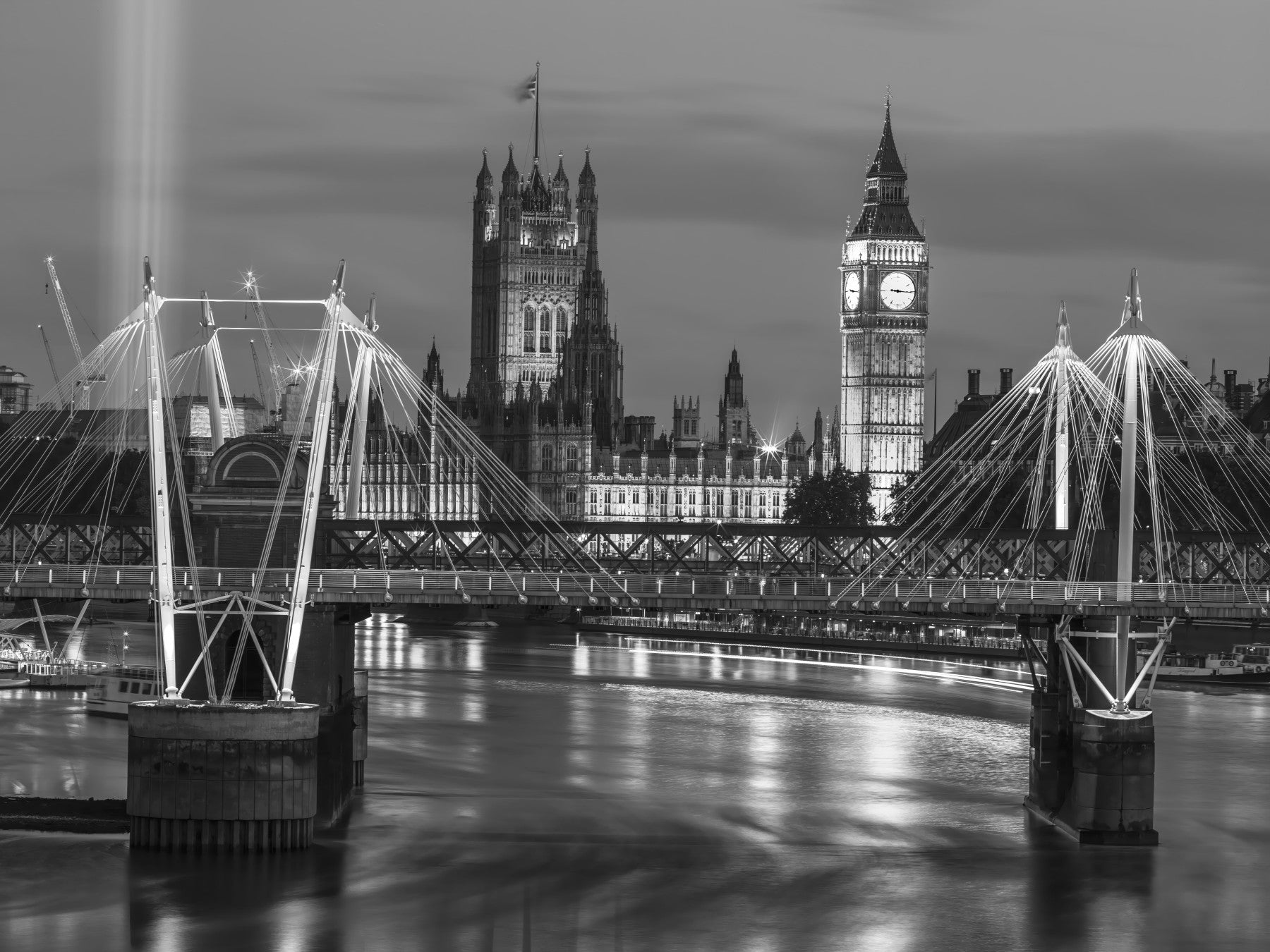 Monochrome London cityscape mural in home office, grayscale tones, modern apartment wall decor