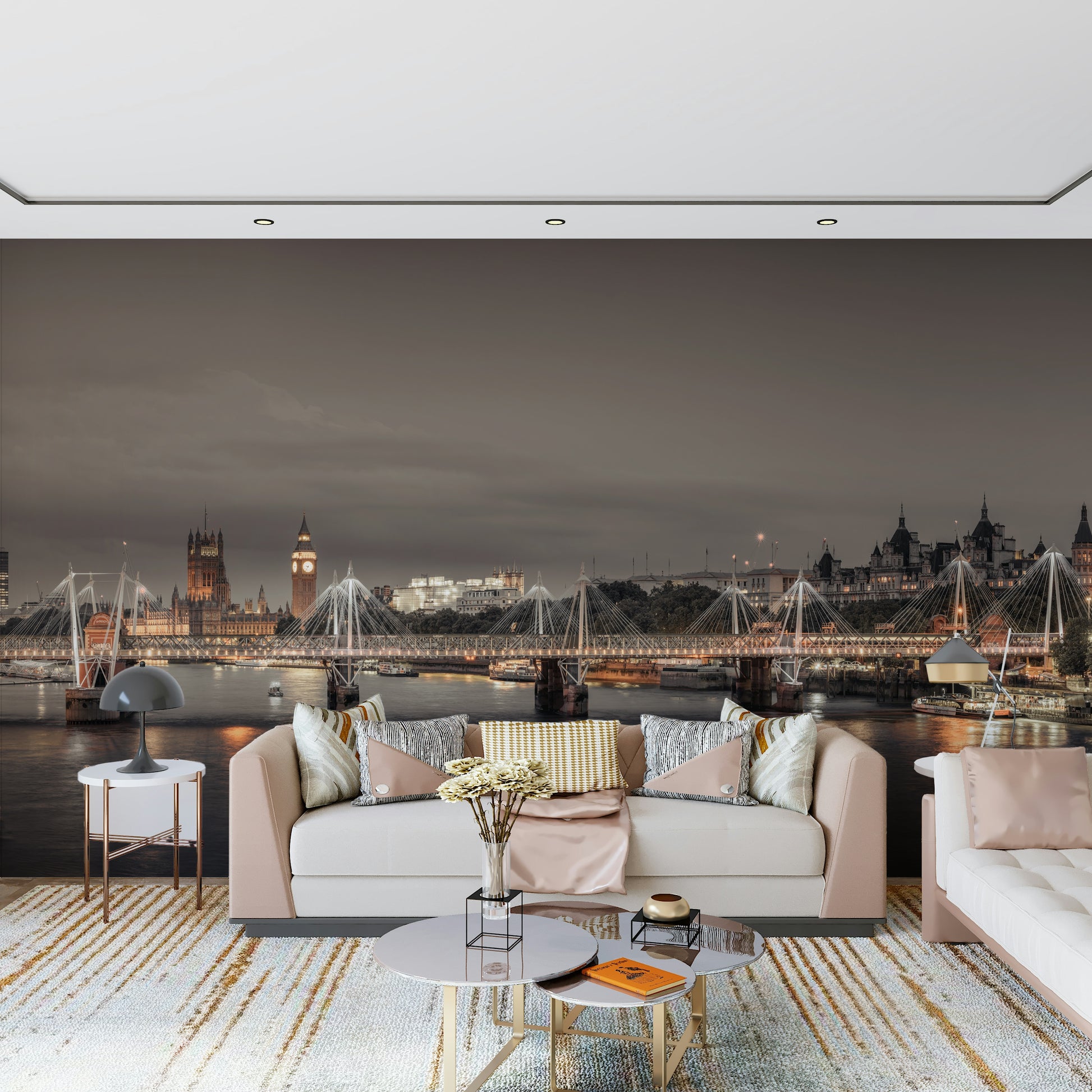 Evening view of the London city skyline with the River Thames. Capture the essence of London's charm with this stunning panoramic wallpaper for walls. The image features iconic landmarks bathed in twilight hues. The London Eye and Houses of Parliament stand proudly along the Thames. This design boasts a serene atmosphere and a touch of urban sophistication, making it ideal for a living room, home office, or entryway. The neutral tones easily complement a variety of interior styles, from modern minimalist to classic traditional.