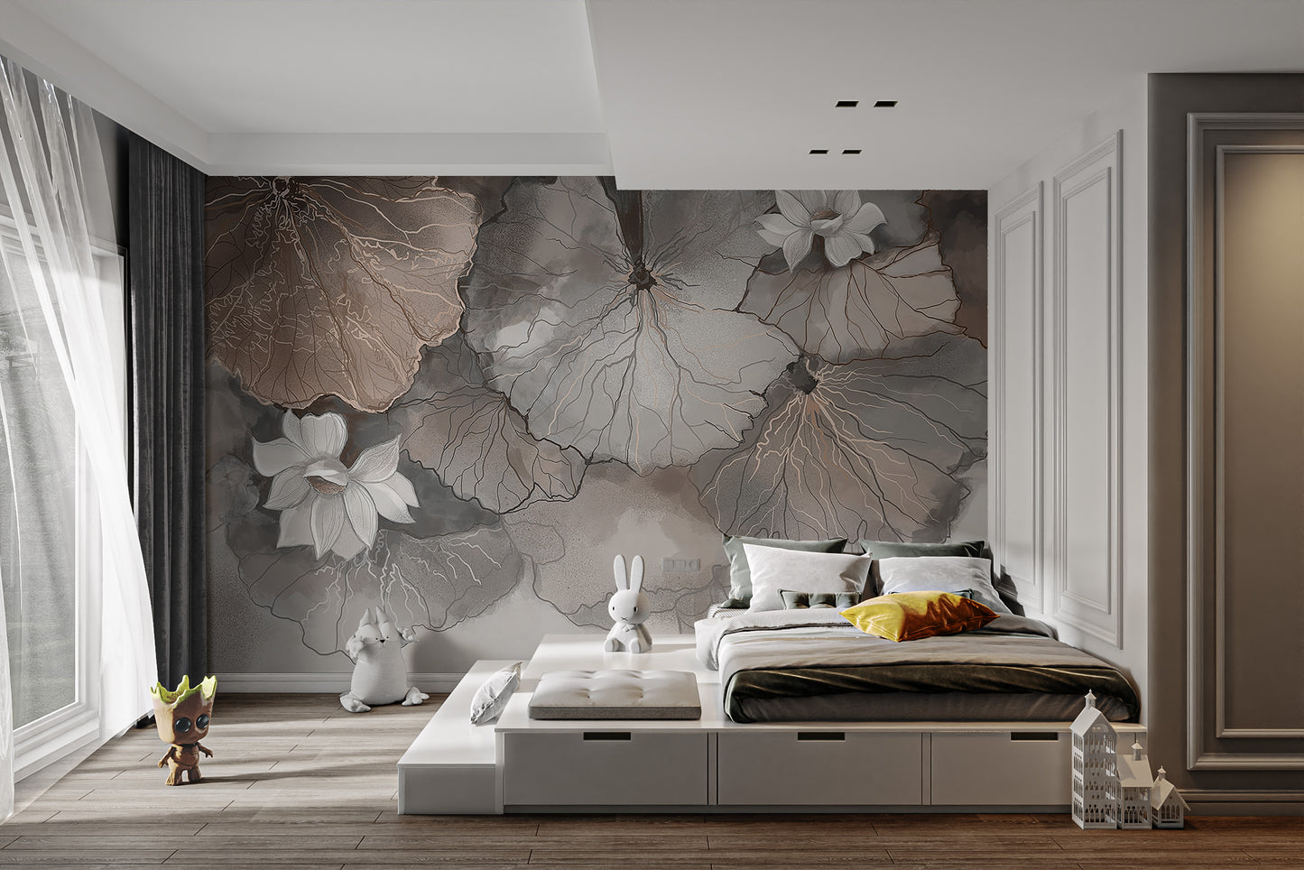 Drape your bedroom walls in the subtle hues of a lotus leaf symphony peach mural. This bedroom wallpaper captures the serene dance of lotus leaves and blossoms unfurling atop calm waters, painted in a delicate peach palette. Each stroke tells a story, a whisper of nature's silent symphony, creating a restful retreat in your sleep sanctuary. As dawn's light filters through, watch these gentle hues come alive, crafting a poetic interplay of shadows and light. This mural is more than a mere backdrop it's a canvas where the ethereal beauty of the lotus pond meets the artistry of watercolor techniques. Envision lying back, wrapped in the soft embrace of this botanical dream, and let the quiet energy of this artistic piece refresh your senses.