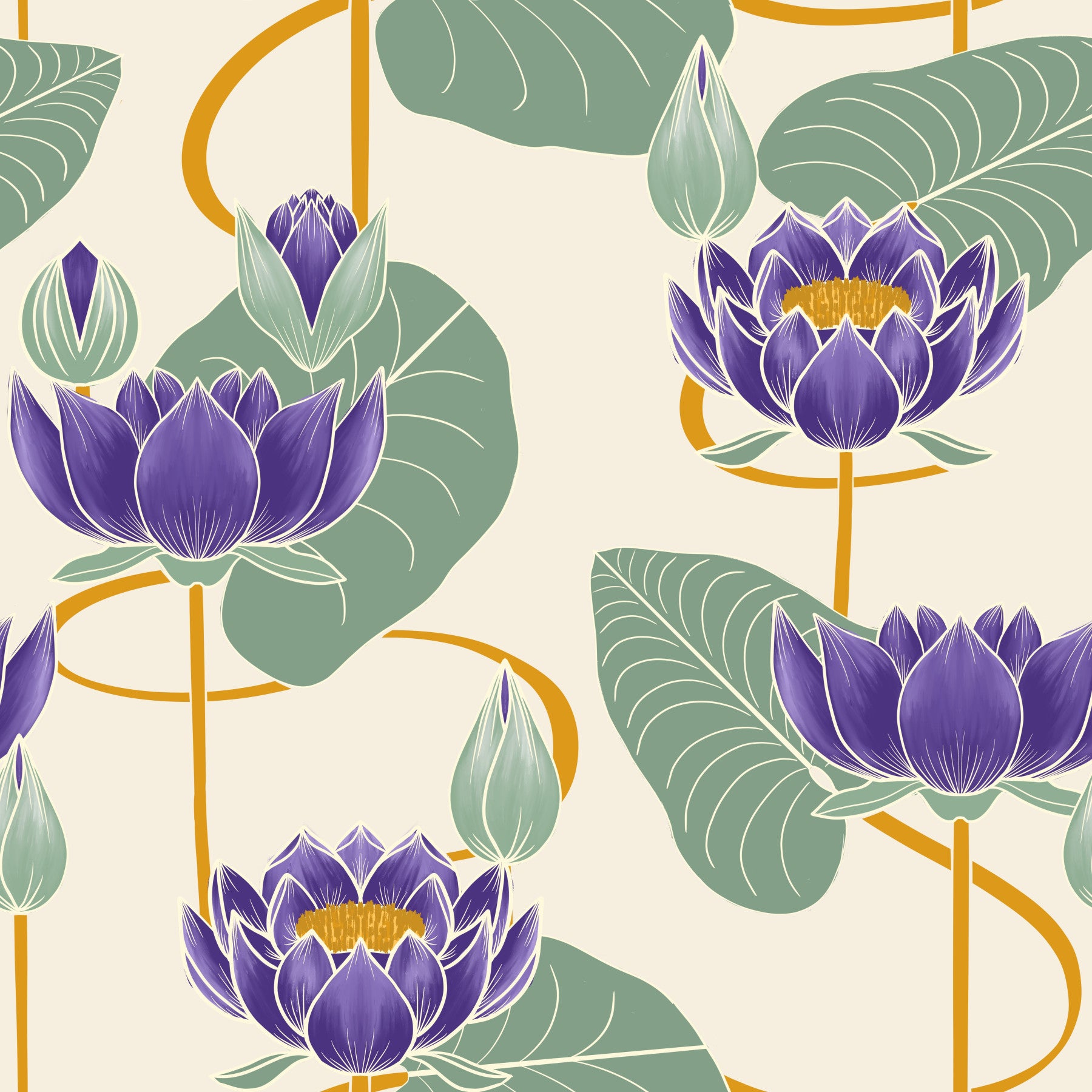 Add a bold touch to your interiors with Lotus Reverie wallpaper. This design features deep purple lotus blooms paired with soft green leaves and golden stems, all placed over a warm cream base. The contrast of rich and muted tones creates an eye-catching look that balances elegance and freshness. Ideal for bedrooms, living rooms, or meditation areas, this wallpaper for walls brings in a mix of modern style and traditional floral art. The symmetrical layout and detailed textures make it perfect for those who enjoy statement pieces in their wall design while keeping a refined and grounded aesthetic.