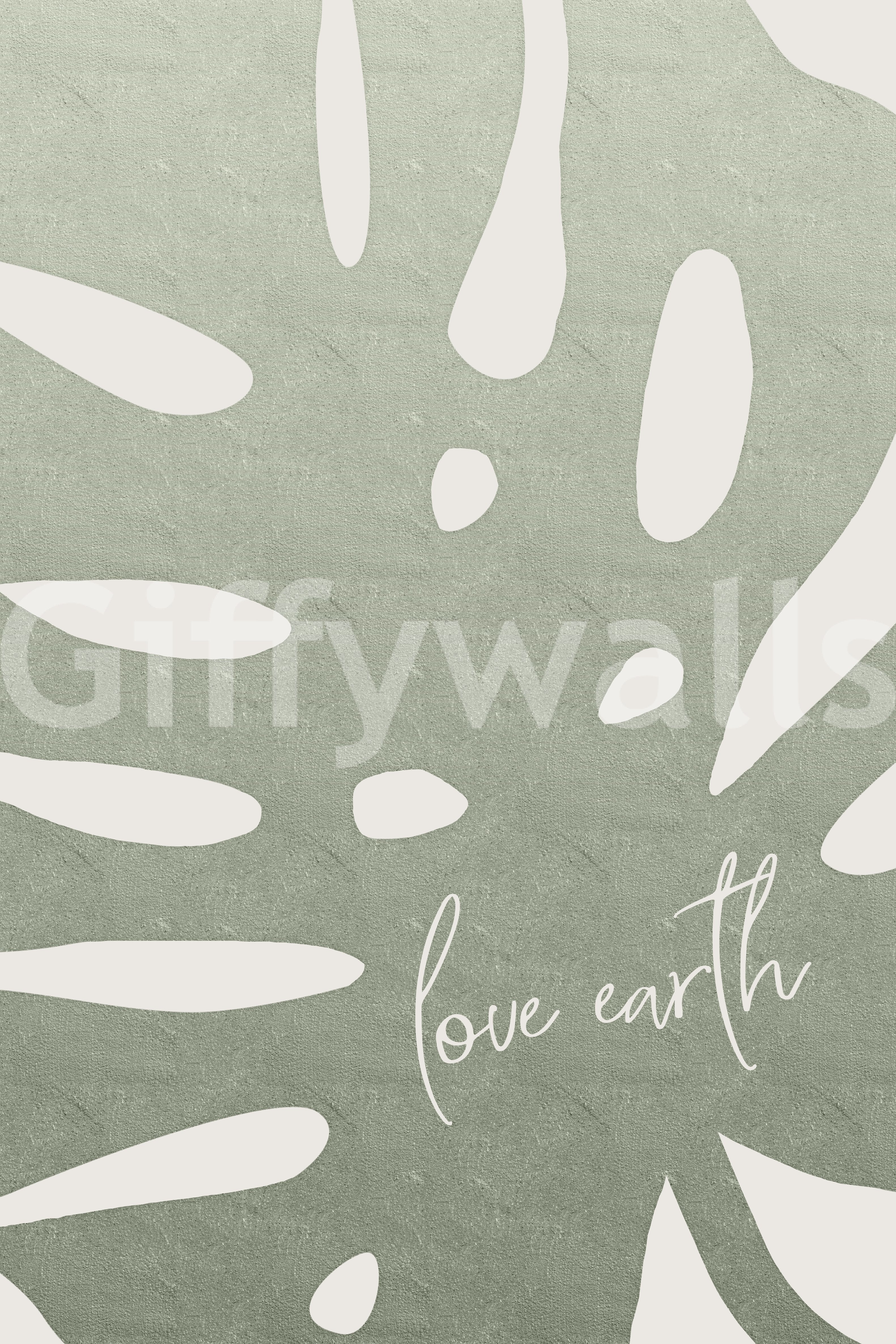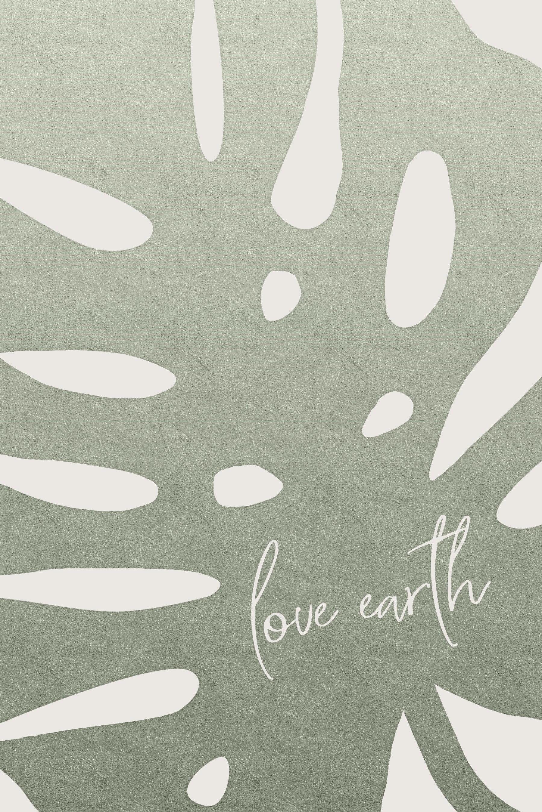 Embrace the beauty of our planet with this serene wallpaper, titled "Love Earth". A muted, earthy green backdrop evokes a sense of calm and connection to nature. Interspersed are simplified, white leaf shapes hinting at the lush flora our Earth offers. The words "love earth" are gracefully handwritten in a light, flowing script, serving as a gentle reminder of our responsibility to care for our environment. This design is perfect for those seeking a minimalist yet meaningful aesthetic, fostering a daily appreciation for the natural world around us.