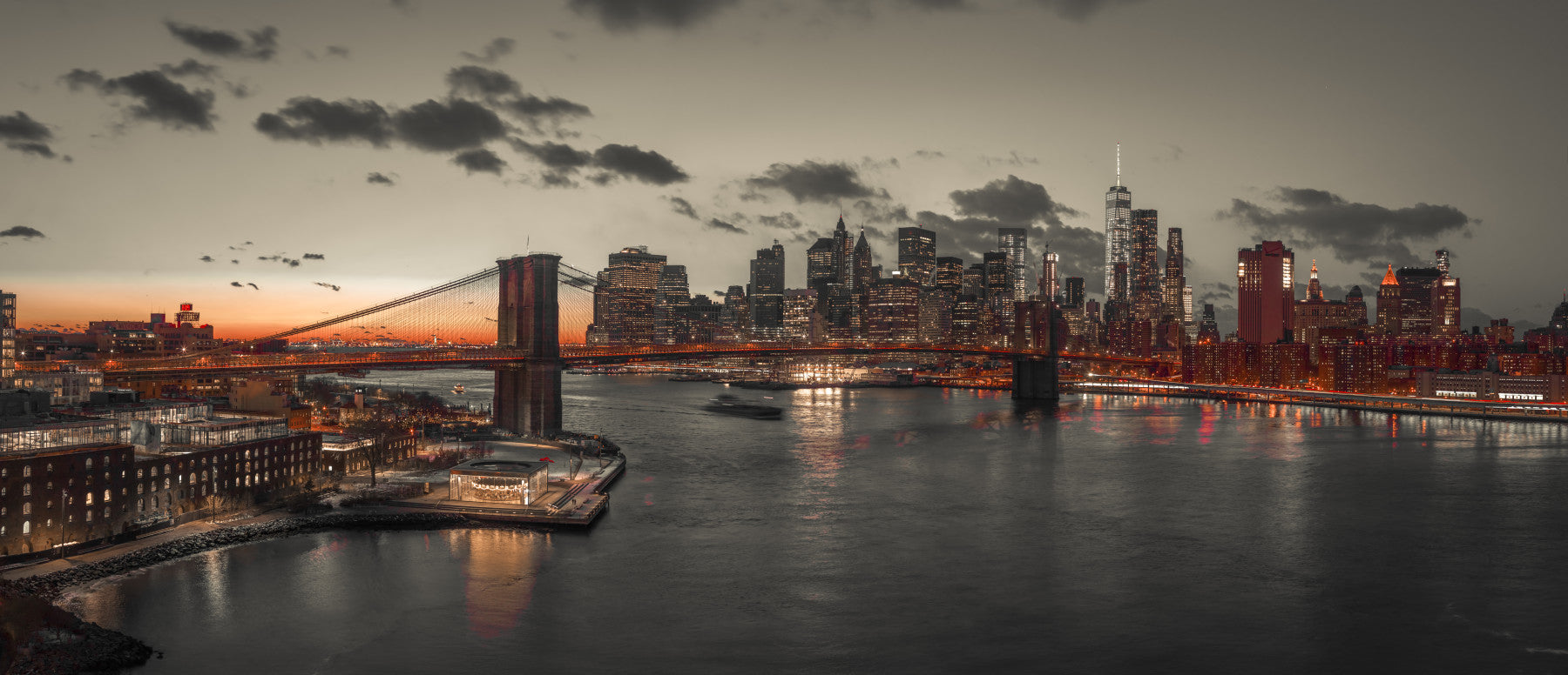 Evening view of Lower Manhattan skyline with Brooklyn bridge over East river, New York. Transform your space with this captivating wallpaper for walls, featuring the iconic Manhattan skyline at dusk. The warm, muted tones create a serene ambiance, while the bridge and city lights add a touch of urban sophistication. The colors blend beautifully, making it ideal for a living room, home office, or bedroom. This design brings a refined touch to any interior and complements a variety of decor styles.