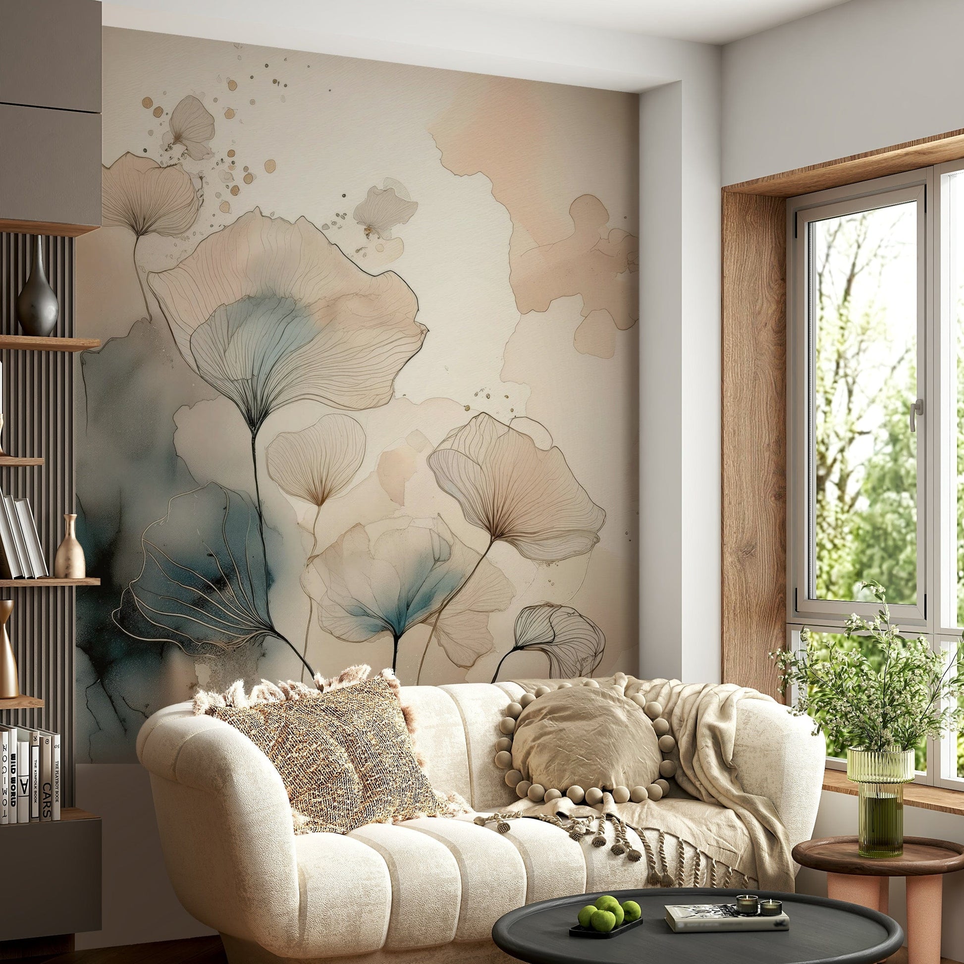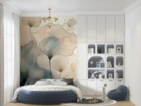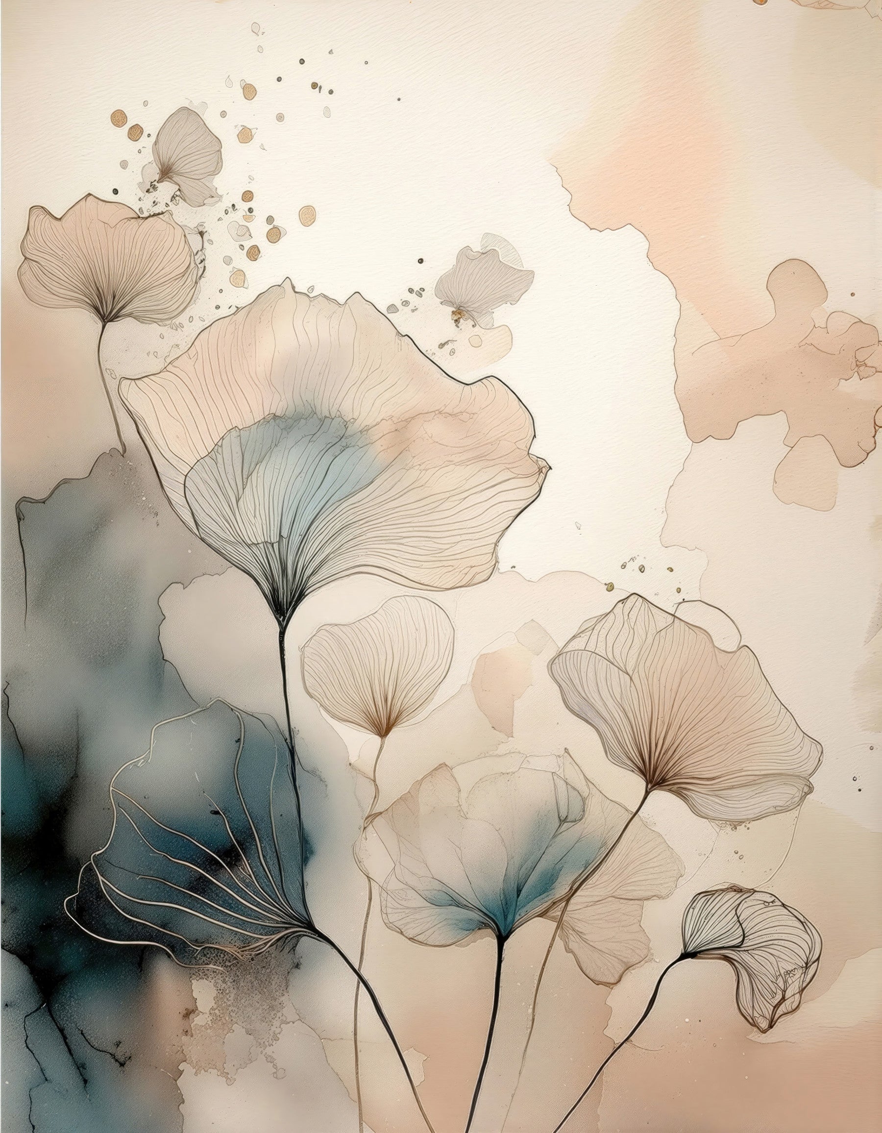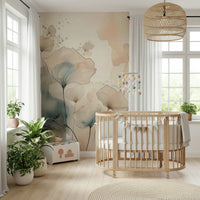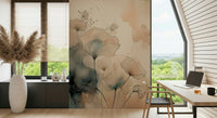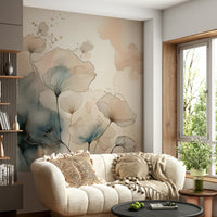 Elevate your interior with this artistic wallpaper for walls, showcasing delicate floral patterns in a watercolour style. The design features ethereal flower-like forms crafted with fine lines and soft watercolour washes. Gentle beige, peach, and muted blue hues lend a sophisticated and calm feel. Ideal for creating a peaceful bedroom, a stylish living room, or an inviting hallway. It enriches minimalist, modern, and classic spaces with its understated elegance.