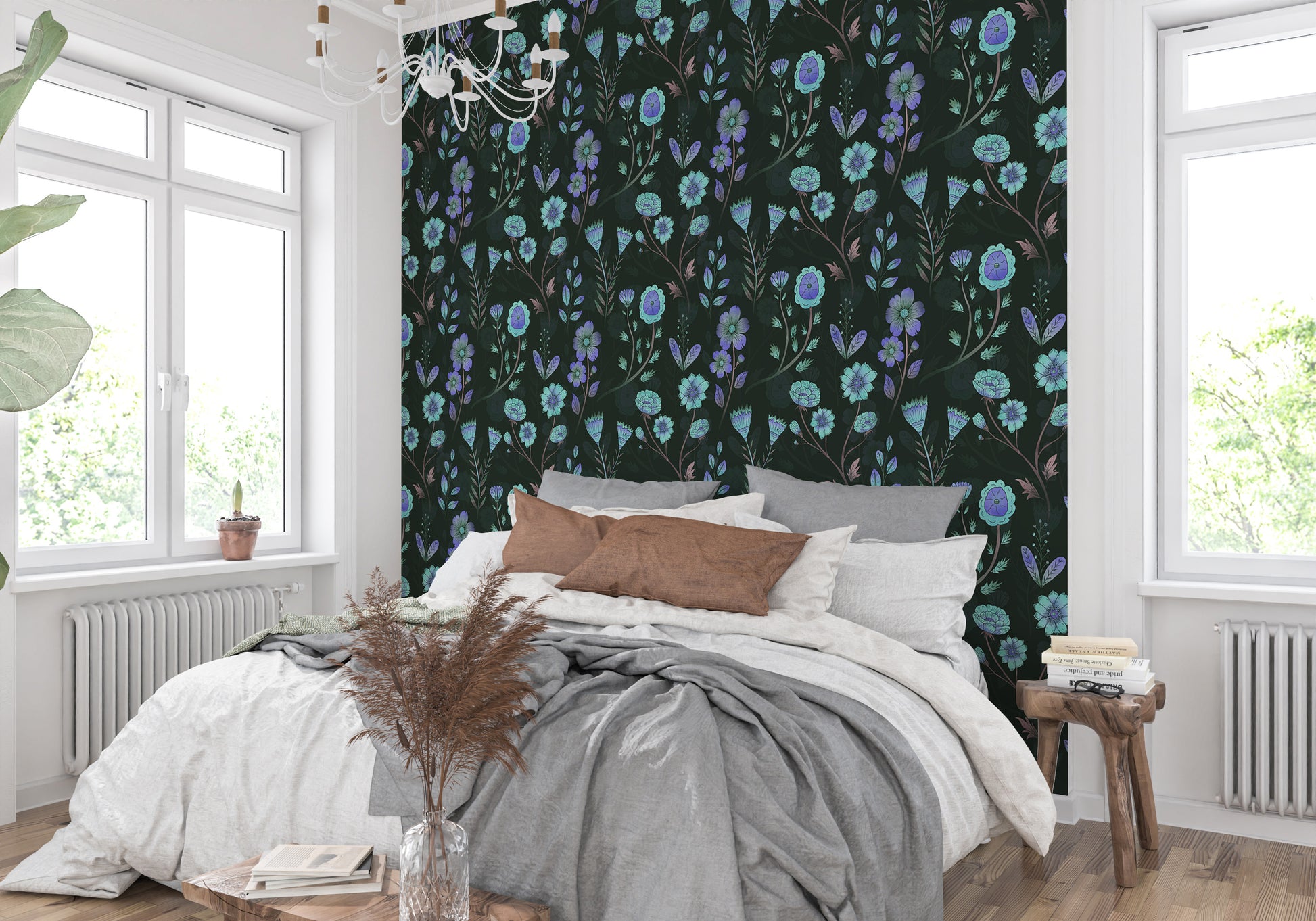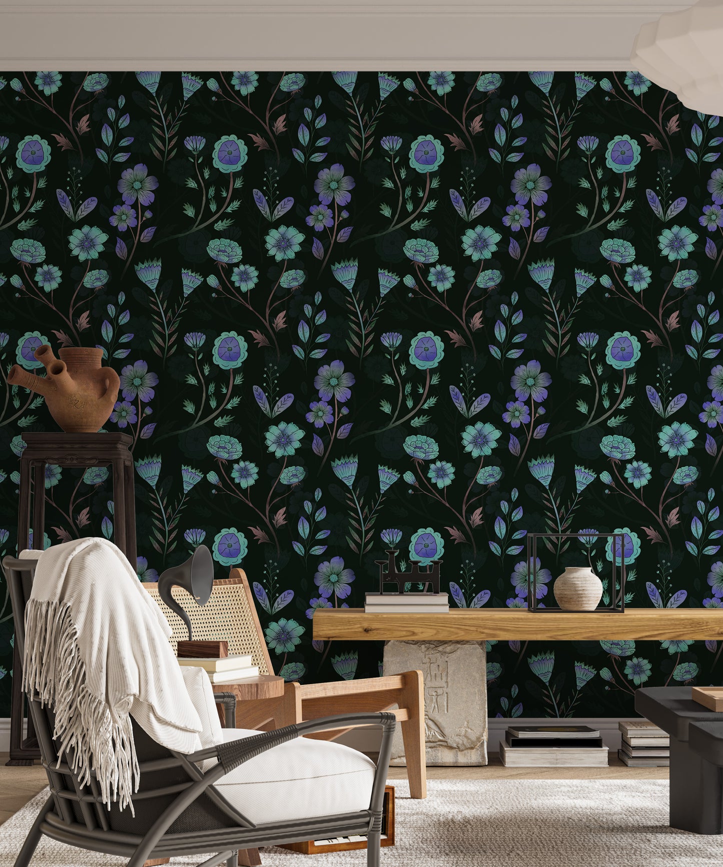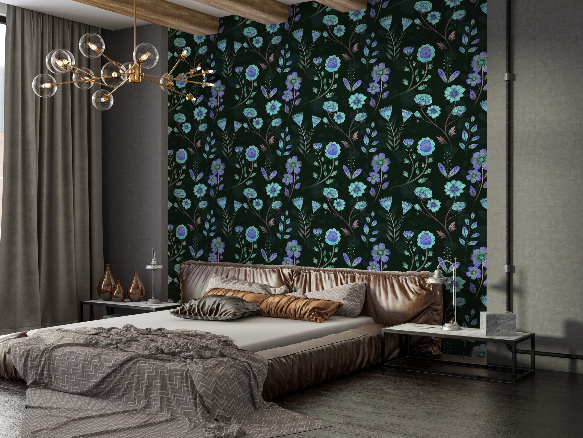 Bring enchantment to your walls with the Luminous Floral Whispers Bluish Tones Wallpaper. Featuring glowing blue and violet floral illustrations against a rich, dark background, this captivating floral wallpaper creates a soothing yet dramatic effect. Each petal seems to shimmer, offering a perfect balance between elegance and edge. Ideal for accent walls, bedrooms, or creative spaces, it transforms interiors with an artful, botanical charm. The intricate detailing and moody hues evoke a magical twilight garden, making it a standout choice for nature-inspired décor. Elevate your space with this bold, beautiful, and effortlessly stylish floral wallpaper design.