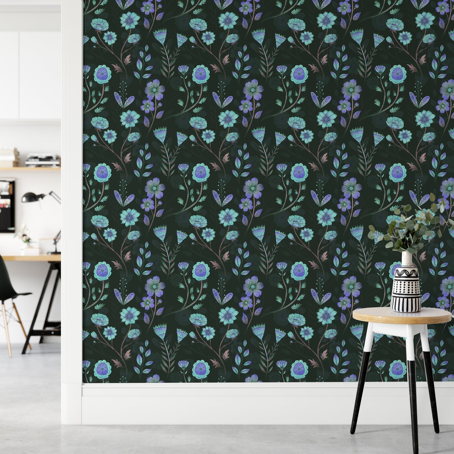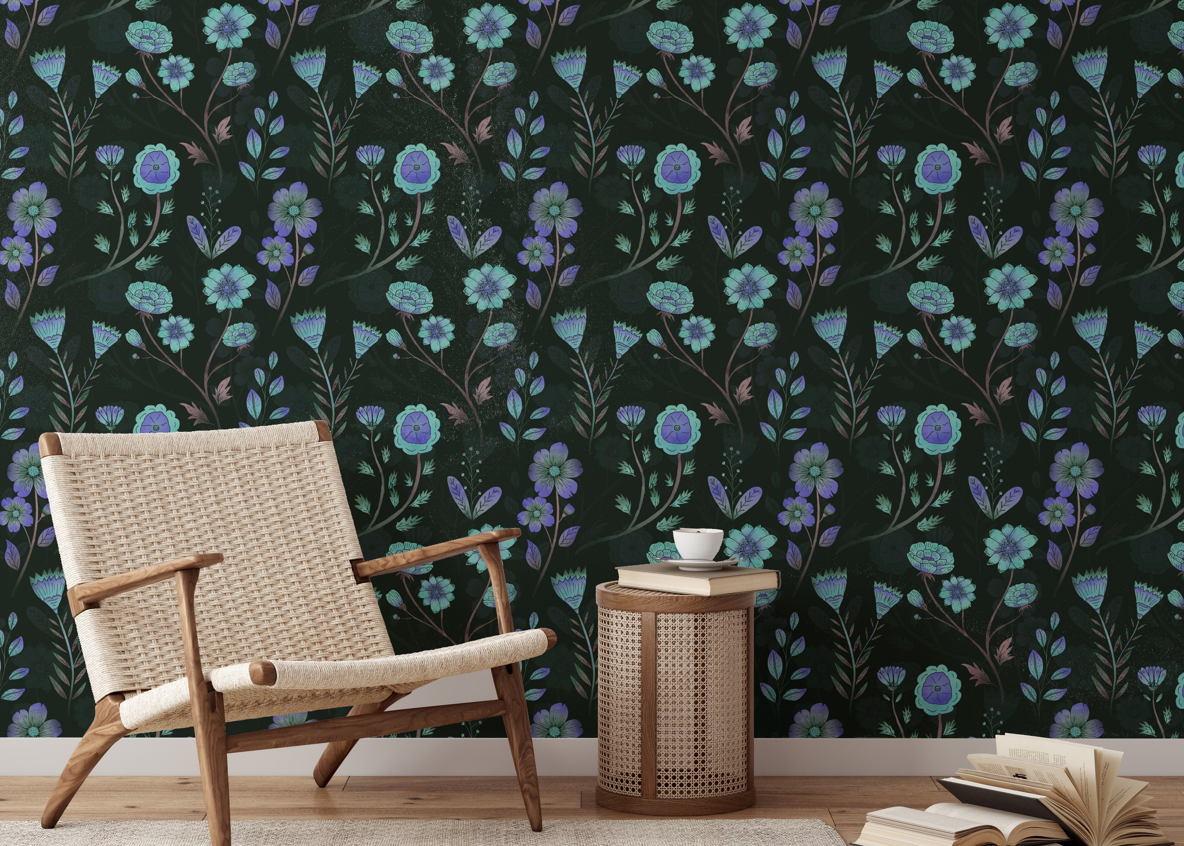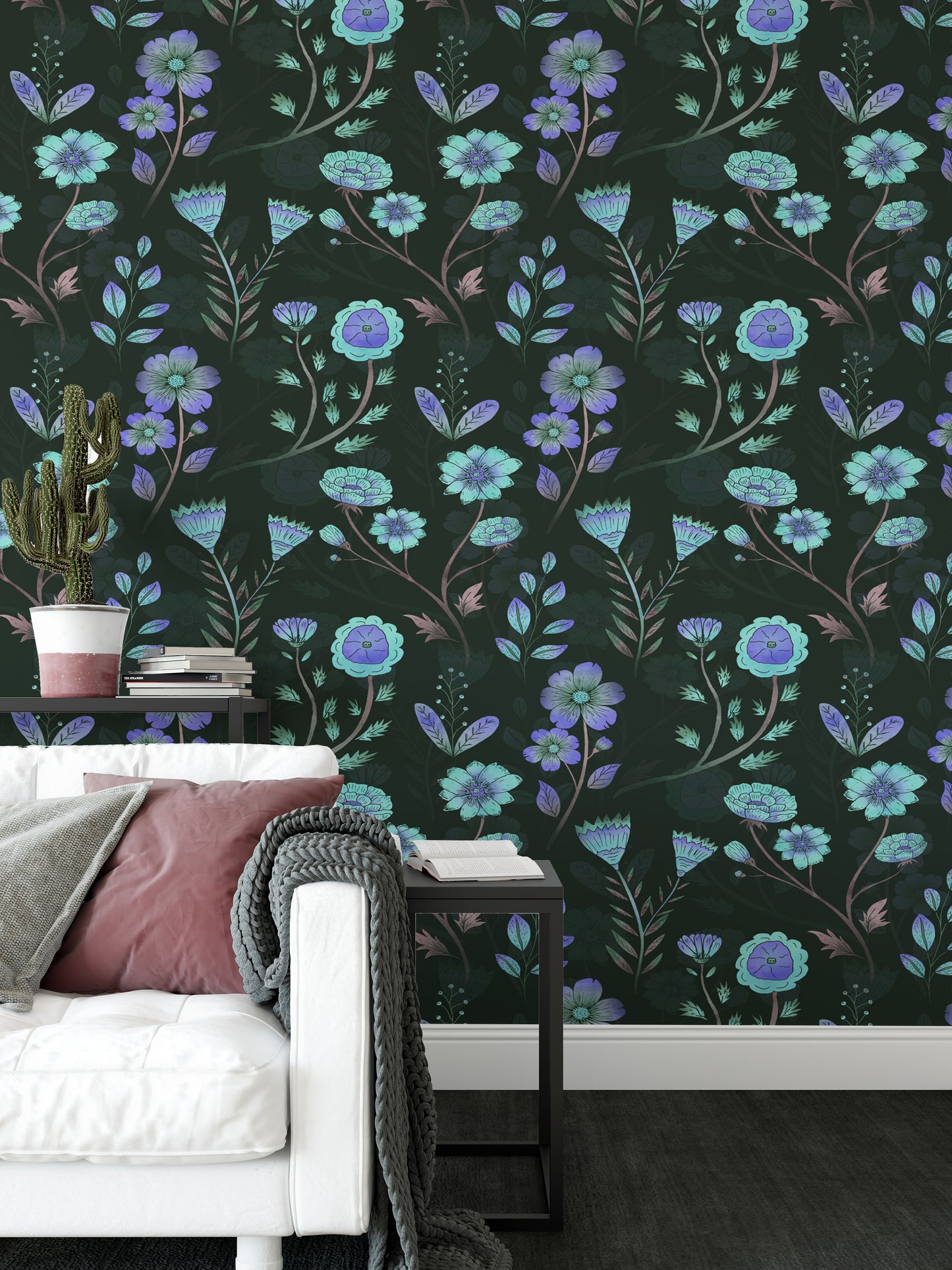 Bring enchantment to your walls with the Luminous Floral Whispers Bluish Tones Wallpaper. Featuring glowing blue and violet floral illustrations against a rich, dark background, this captivating floral wallpaper creates a soothing yet dramatic effect. Each petal seems to shimmer, offering a perfect balance between elegance and edge. Ideal for accent walls, bedrooms, or creative spaces, it transforms interiors with an artful, botanical charm. The intricate detailing and moody hues evoke a magical twilight garden, making it a standout choice for nature-inspired décor. Elevate your space with this bold, beautiful, and effortlessly stylish floral wallpaper design.