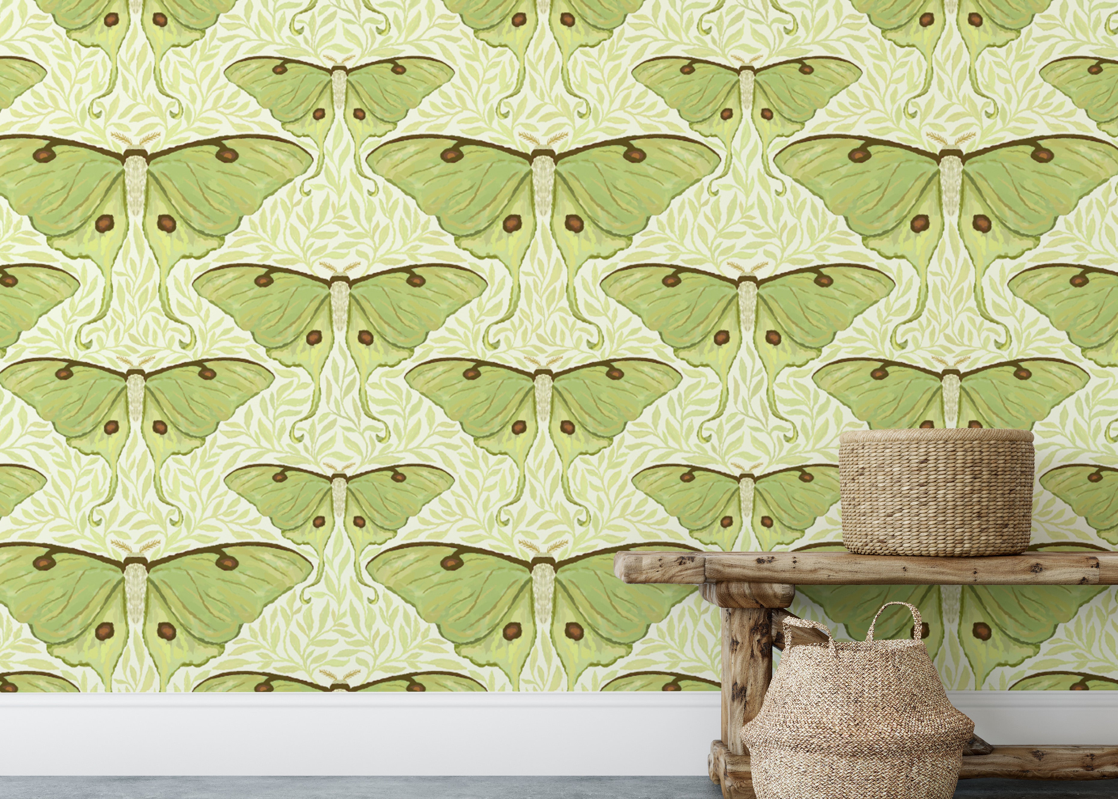 Luna Moth and Leaves Wallpaper Mural This wall mural adds a layer of elegance to any space with its ornate pattern. ThisNaturefirst impressive Wallpaper actually shows the detailed moths which really seems so realistic and also display large light leaves that are just perfect to smoothness of this beautiful wallpaper. The soft greens pictured are quiet and create a serene space like bedrooms, living rooms or other spaces that could use an easy updated. This wallpaper has been created with attention to detail for those wanting a statement wall featuring a contemporary twist. Grab the Luna Moth and Leaves now, for free as part of our subscription towards a new wall look today!