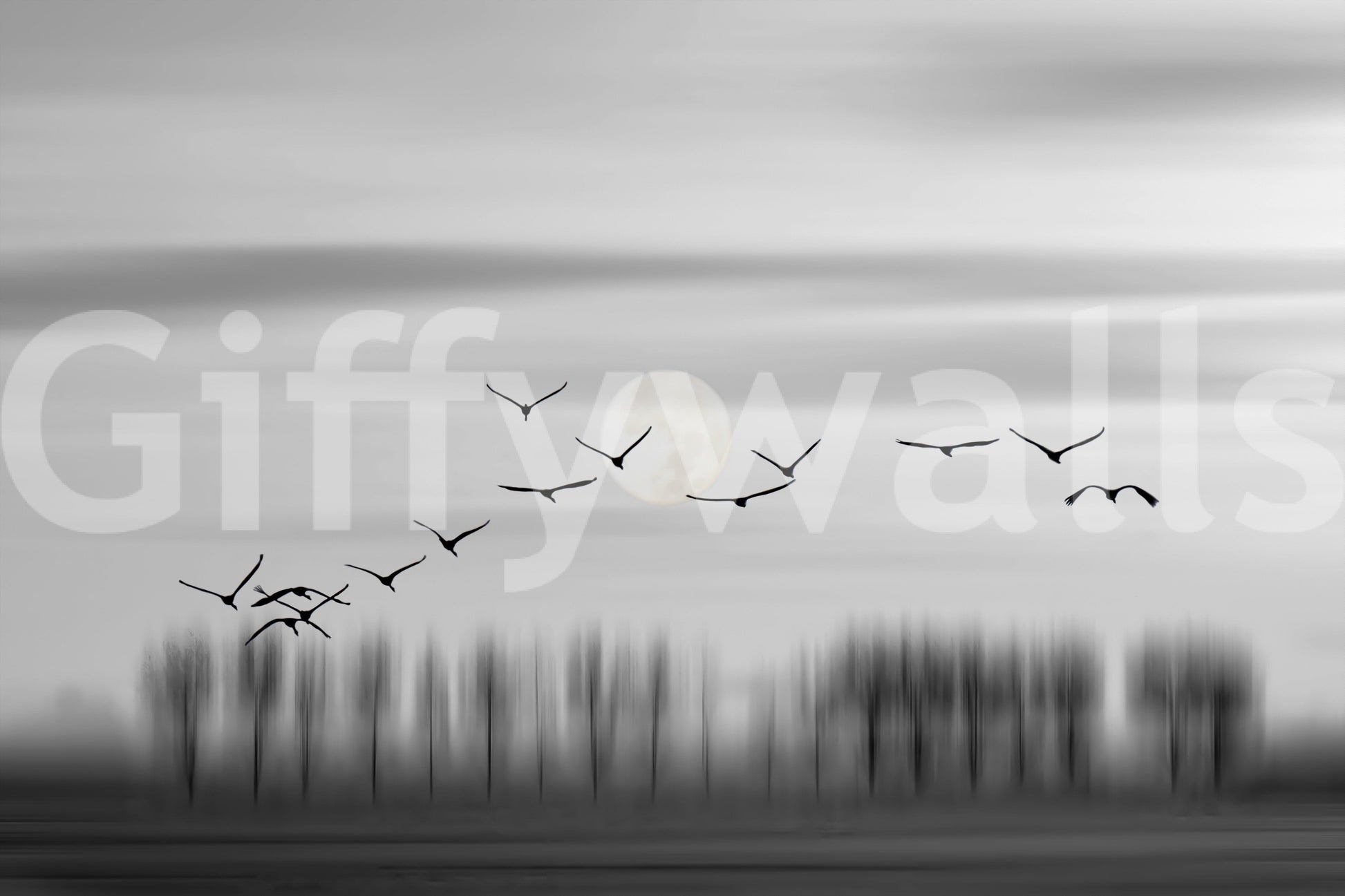 Decorative wall mural showcasing birds in flight under a luminous lunar backdrop.