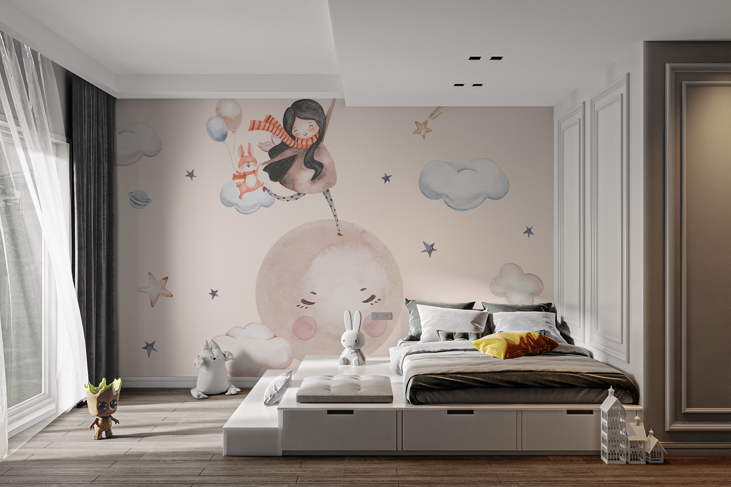 Charming space-themed wallpaper for kids with a floating girl and sleepy moon.