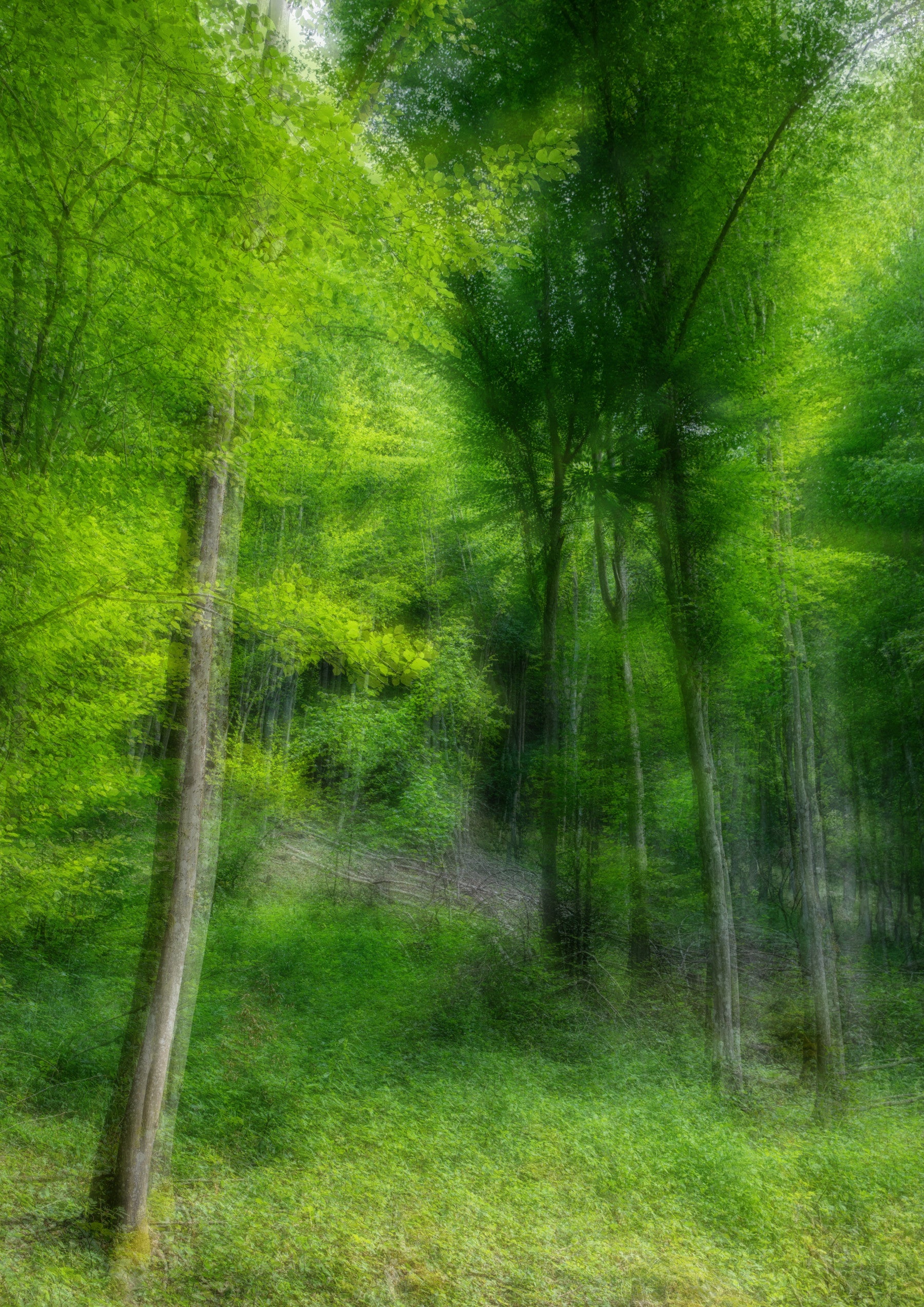 This stunning abstract photography piece presents a lush green forest, where the interplay of light and foliage creates a dreamlike atmosphere. The vibrant greens and soft textures evoke a sense of tranquility, inviting viewers to explore the beauty of nature.