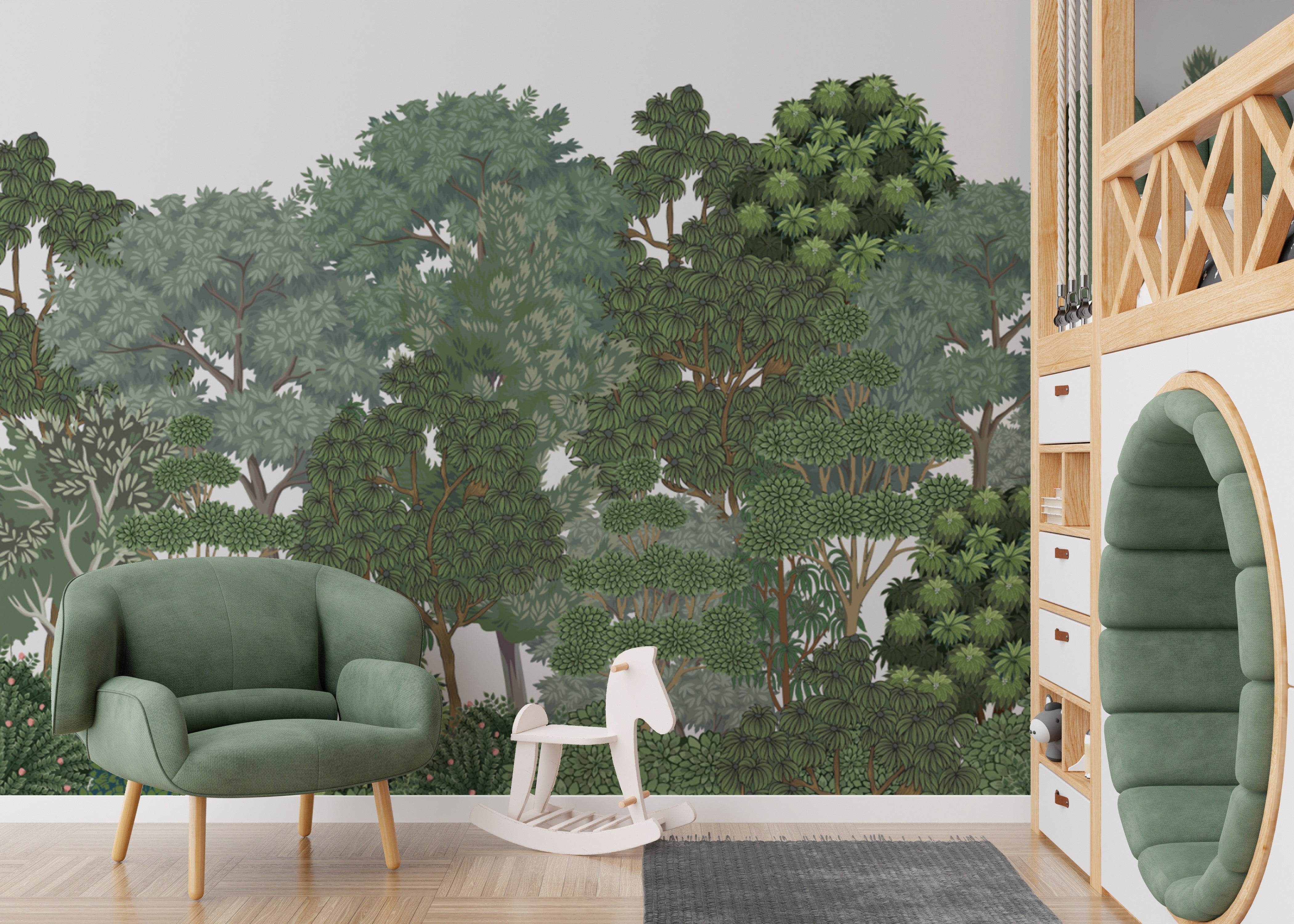 The lush green forest wallpaper mural brings the beauty of nature indoors with dense trees and vibrant foliage. The green botanical jungle wallpaper features hand-drawn details, creating a serene atmosphere. Layers of deep green leaves and tall trees enhance any room with a natural aesthetic. This dense tree canopy mural suits bedrooms, living rooms, and offices, blending well with modern and rustic interiors. The detailed nature-inspired forest wallpaper adds depth, making walls feel expansive. The rich, earthy tones and intricate botanical patterns highlight the beauty of vibrant green foliage wallpaper, offering a timeless and refreshing appeal for any space.