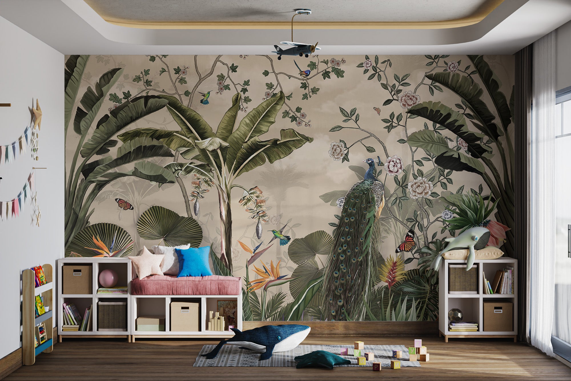 Transform your space with the luxury peacock tropical jungle wallpaper, a stunning tropical jungle wallpaper mural that brings nature’s elegance indoors. Featuring a majestic peacock, exotic botanical wallpaper elements, lush greenery, and delicate hummingbirds, this design creates a vintage rainforest wall mural ambiance. Perfect for bedrooms, living rooms, and offices, this hand-painted tropical mural wallpaper adds sophistication to any decor. The intricate floral details and bohemian botanical wallpaper style make it ideal for luxury interiors. Elevate your walls with this nature-inspired wall mural decor, blending vibrant wildlife with artistic beauty for a timeless, serene atmosphere. Easy to install and durable.