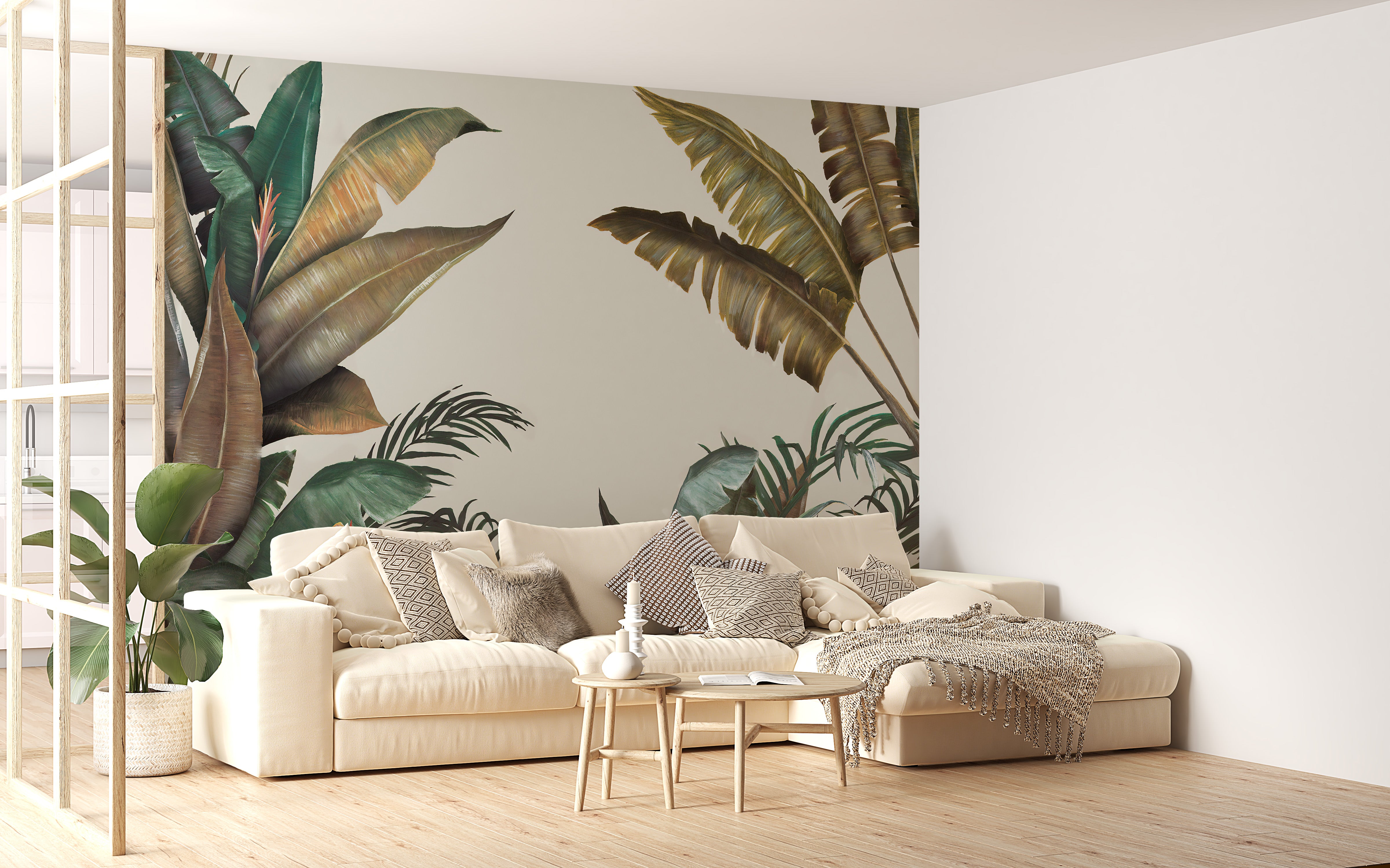 Green & Dusty Yellow Tropical Leaves Wallpaper Mural - Giffywalls