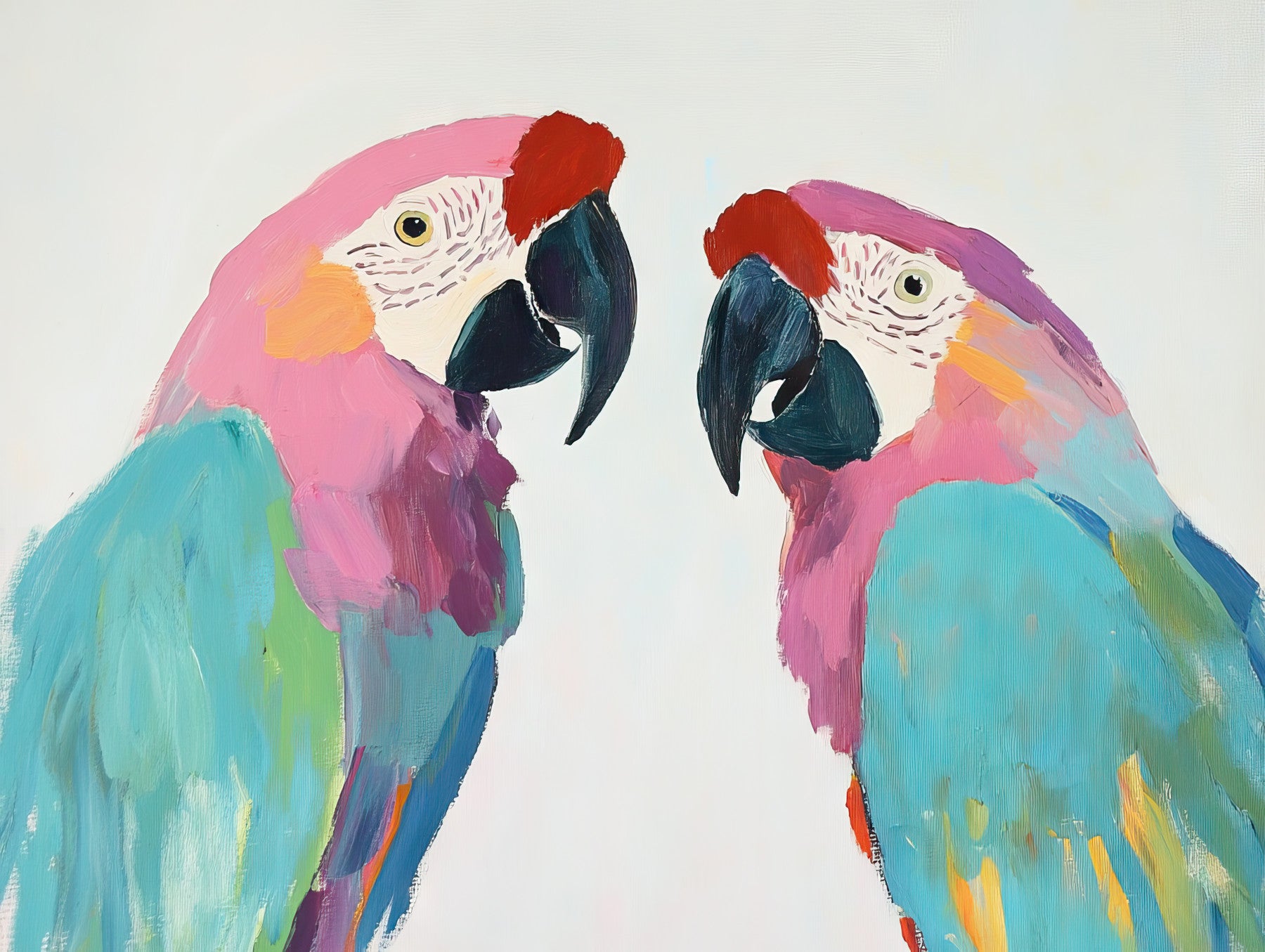 A vibrant and expressive artwork featuring two macaws, painted in a bold, impressionistic style. The birds' plumage is rendered in a captivating palette of pinks, teals, and oranges, with visible brushstrokes adding texture and dynamism to the piece. Their intelligent eyes and expressive poses create a sense of connection and intrigue. This wallpaper offers a striking visual contrast against a soft, off-white background, making it a perfect choice for those who appreciate both bold color and artistic flair. The painting's energy and vibrant hues bring a touch of the tropics and the beauty of these magnificent birds to any digital device.