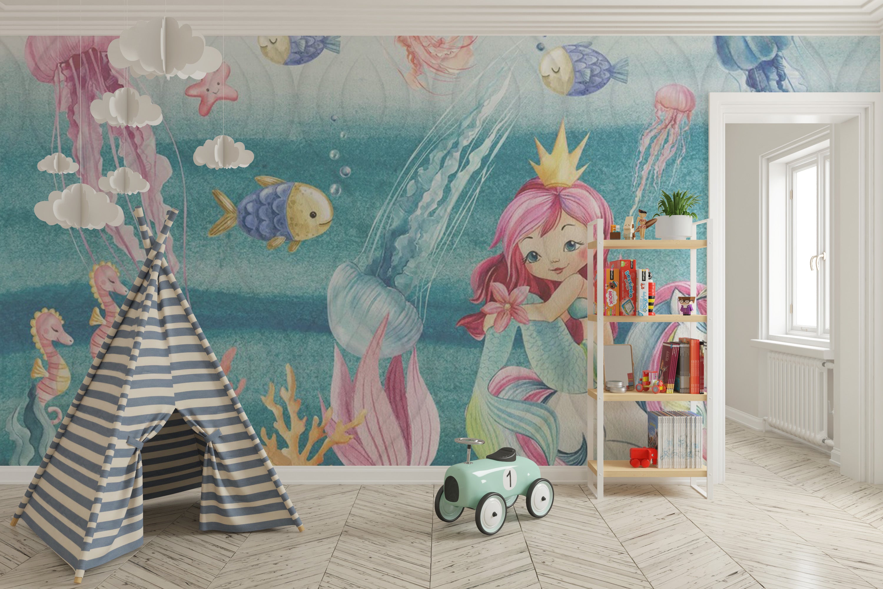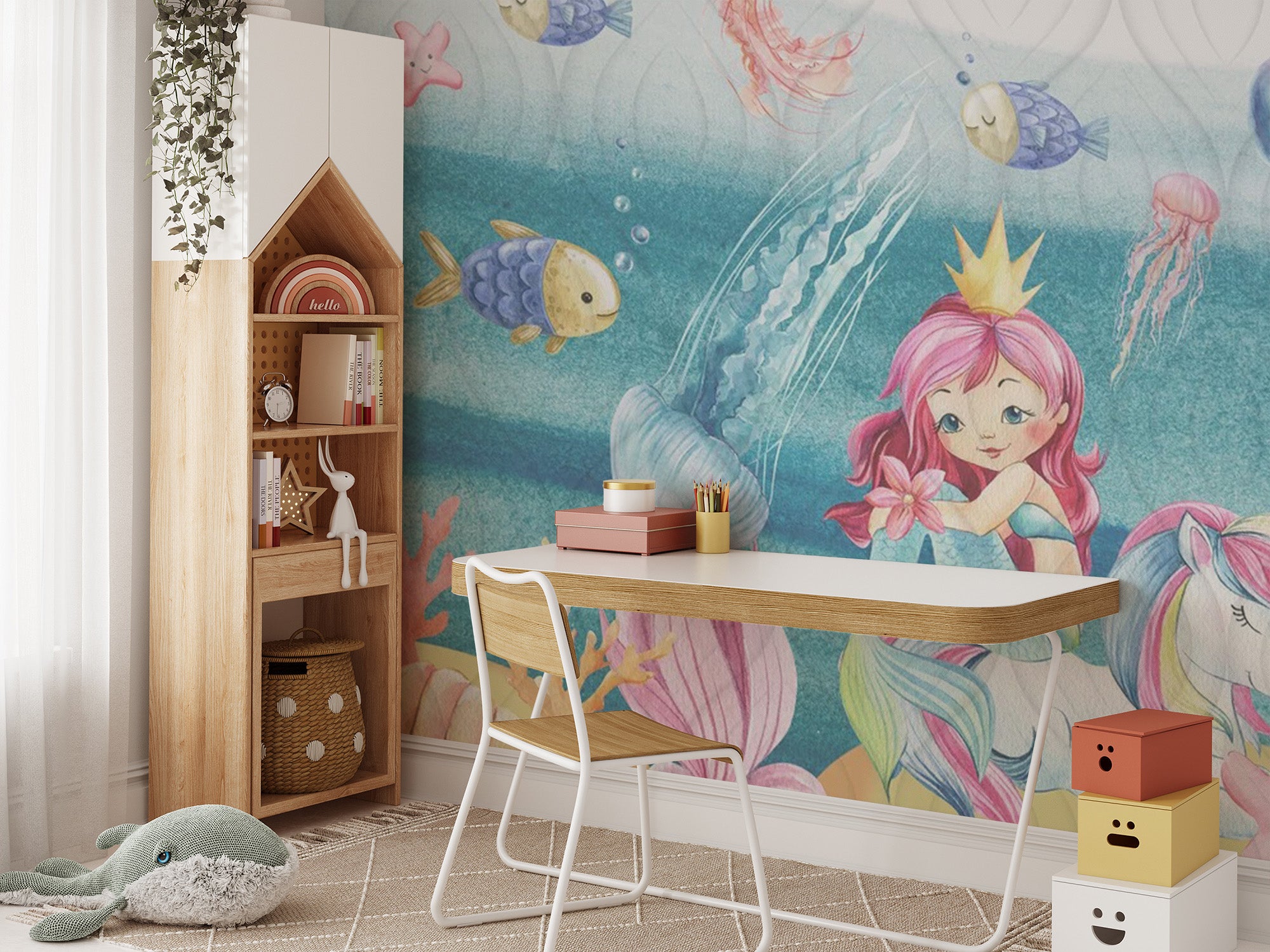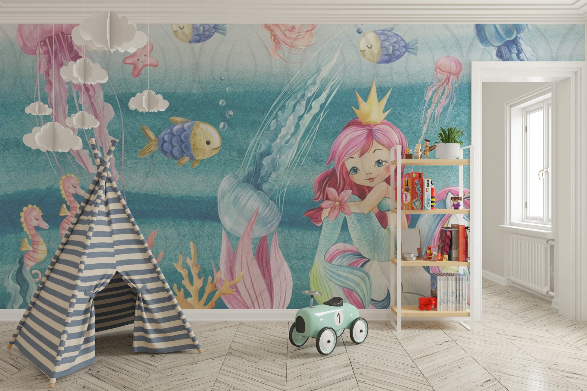 Transform your child's room into an underwater adventure with magical mermaid girls room wallpaper. This vibrant girls room wallpaper features a delightful mermaid, colorful fish, and playful sea creatures, creating a lively and engaging atmosphere. Perfect for a girls' room, this wallpaper is designed to be easy to apply and long-lasting, ensuring that your child can enjoy their magical space for years to come. The high-quality material ensures durability and ease of maintenance, making it a practical choice for any parent. Invest in this enchanting wallpaper today and create a space your child will love. Order now and get free shipping!