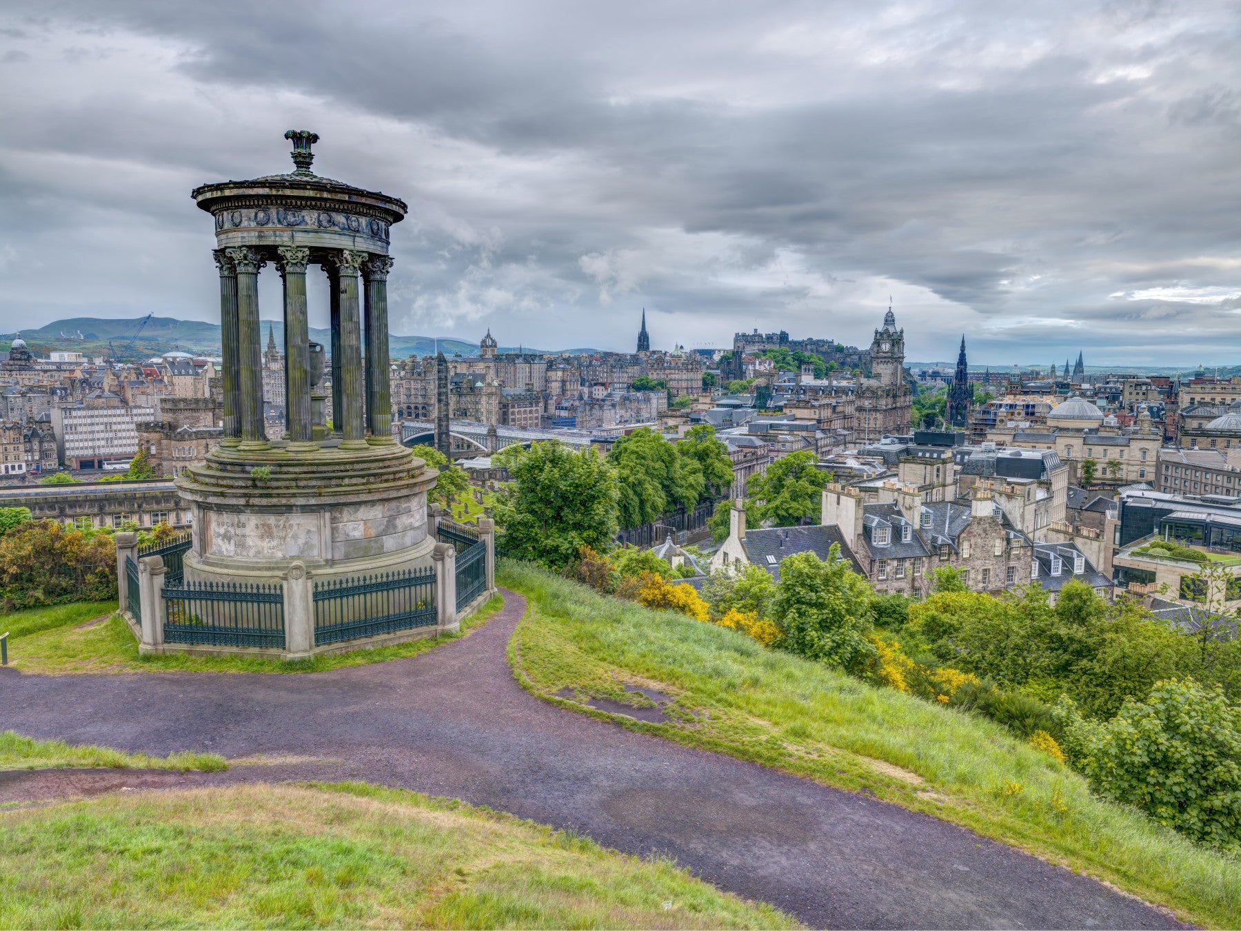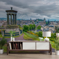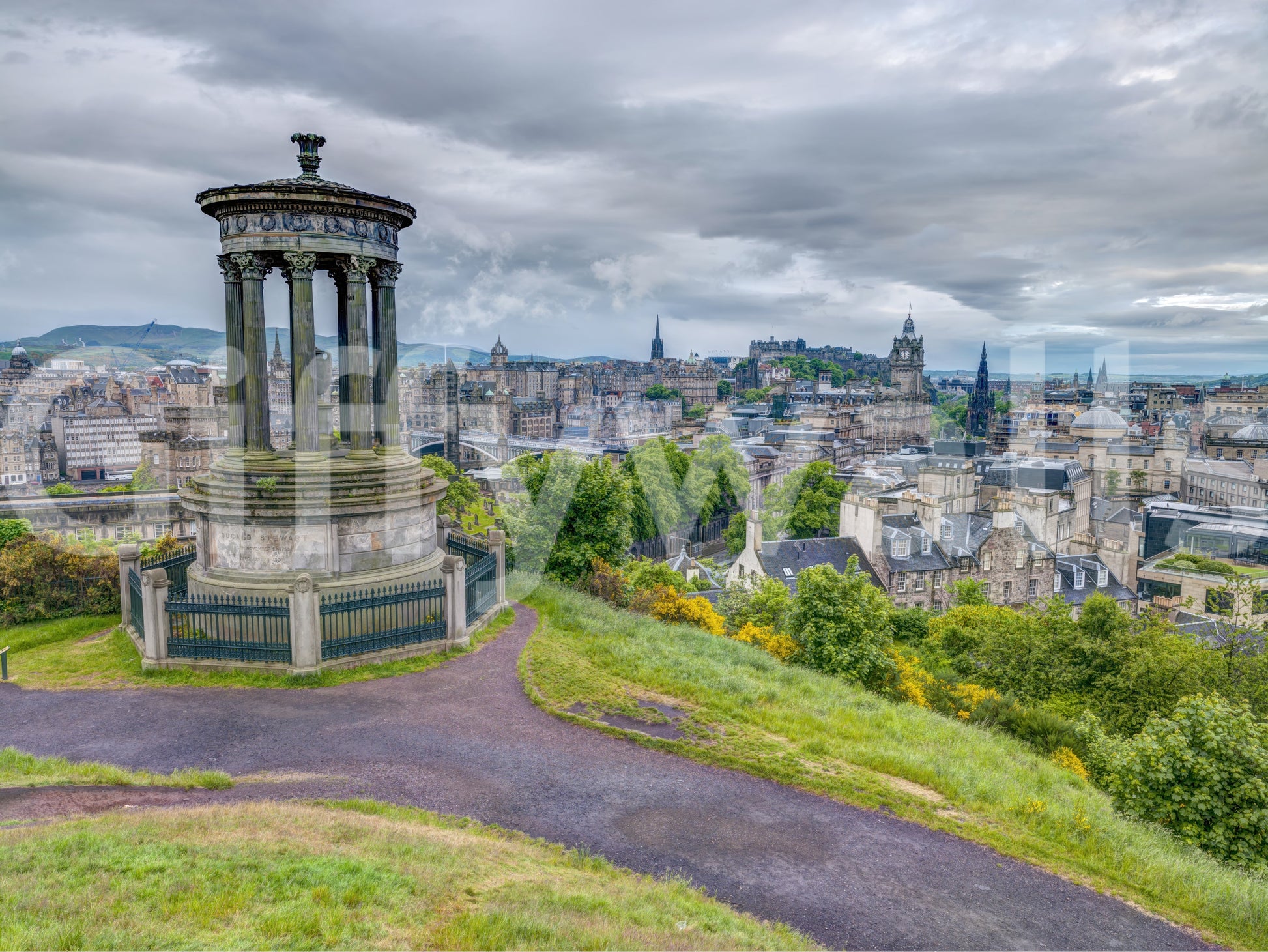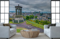 Edinburgh cityscape from Calton Hill, Scotland. Transform your living space with this captivating depiction of a historic cityscape viewed from a majestic hilltop. The scene unfolds with a stunning monument taking centre stage, overlooking a sprawling urban landscape bathed in soft, diffused light. The architectural tapestry is a symphony of rooftops and spires reaching toward the heavens, evoking a sense of timeless grandeur. The composition balances the man-made structures with natural elements, from the verdant hillside in the foreground to the distant mountains that soften the horizon. The overall mood is serene and contemplative, inviting you to escape into a world of architectural wonder and breathtaking views. A conversation piece guaranteed to add character and sophistication to any room.