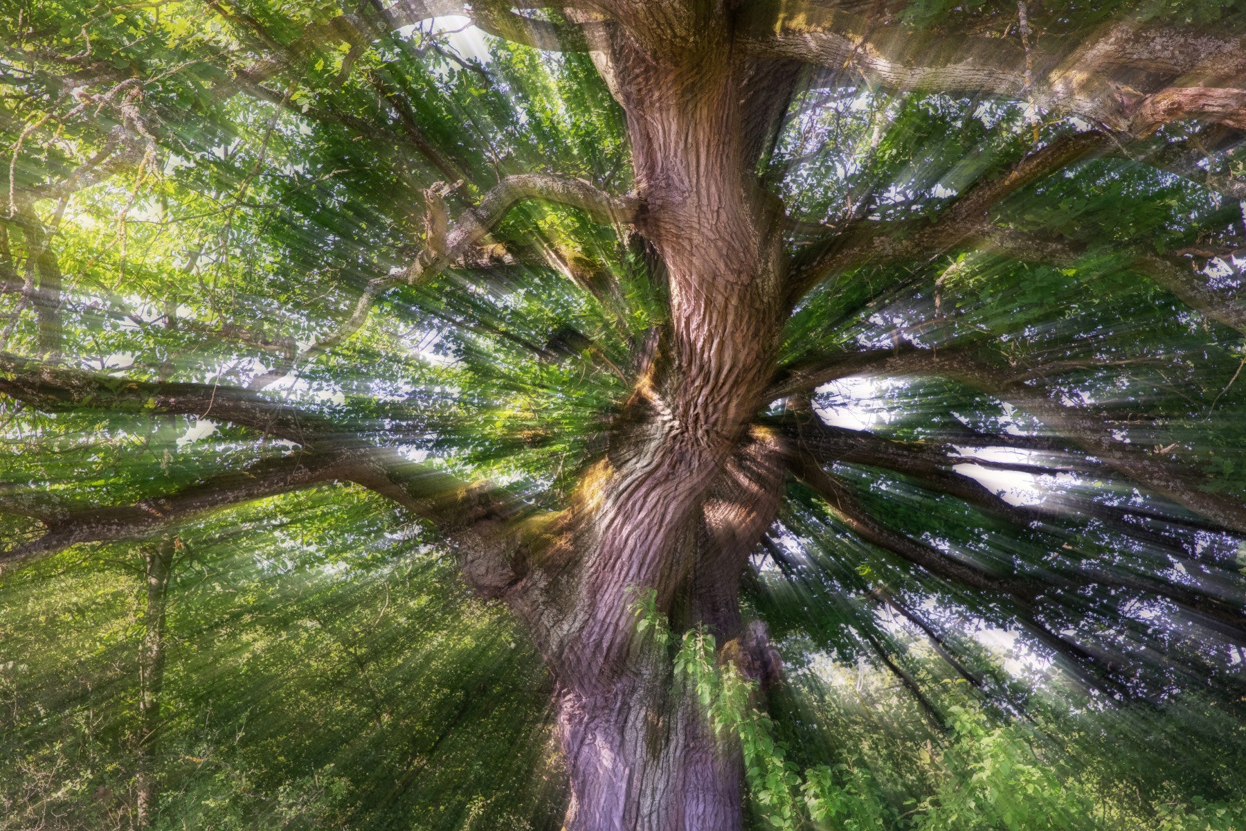 This stunning photograph presents a majestic tree, its branches reaching out in a dynamic display of light and texture. The interplay of sunlight filtering through the leaves reveals the intricate details of the bark and foliage, creating a captivating visual experience.