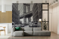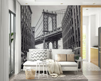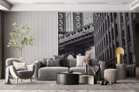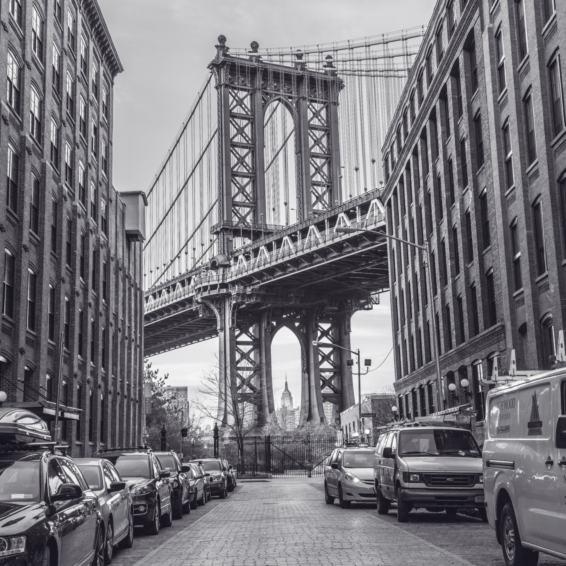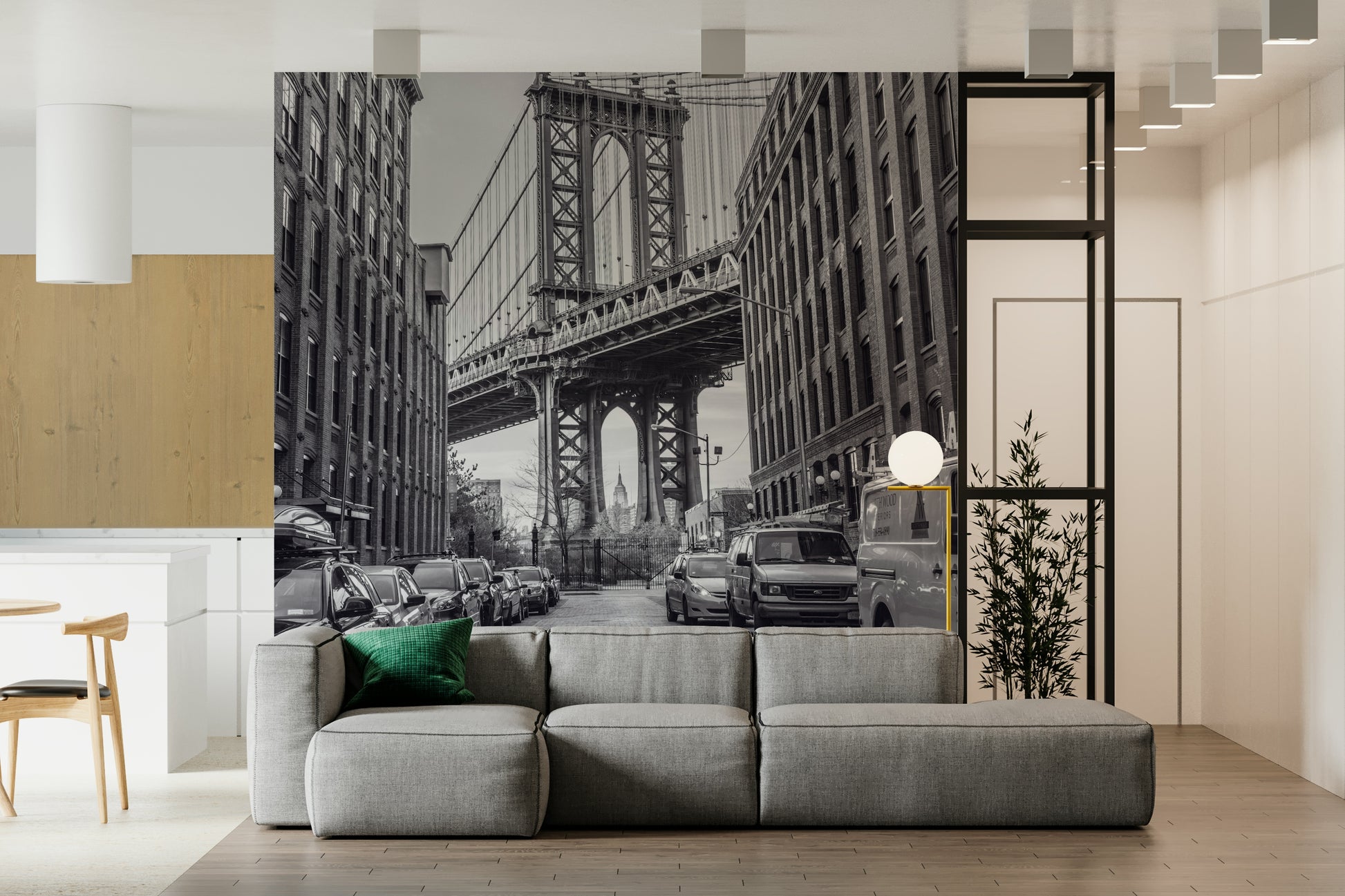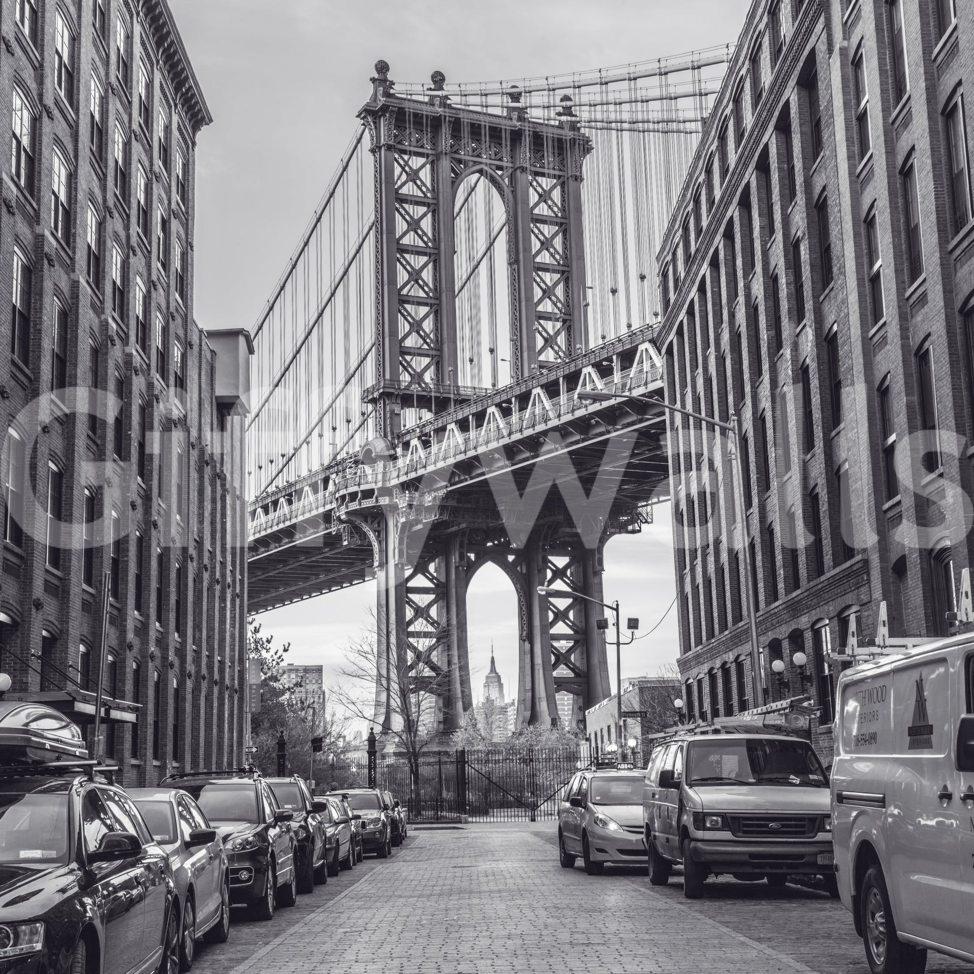 Manhattan Bridge seen from the Dumbo neighbourhood in Brooklyn, New York. Capture the essence of old New York with this captivating black and white wall décor piece, presenting a unique perspective of the iconic Manhattan Bridge as viewed from the charming Dumbo neighbourhood. The image showcases the bridge's imposing structure framed by the classic brick facades of surrounding buildings, creating a powerful sense of depth and architectural grandeur. The cobblestone street adds a touch of vintage charm, evoking a sense of timelessness and urban grit. In the distance, a glimpse of the Empire State Building appears beneath the bridge arch, weaving together layers of New York City history and iconic landmarks. This artwork brings a touch of sophisticated urban style to any room, perfect for those who appreciate classic photography and the allure of the city that never sleeps.