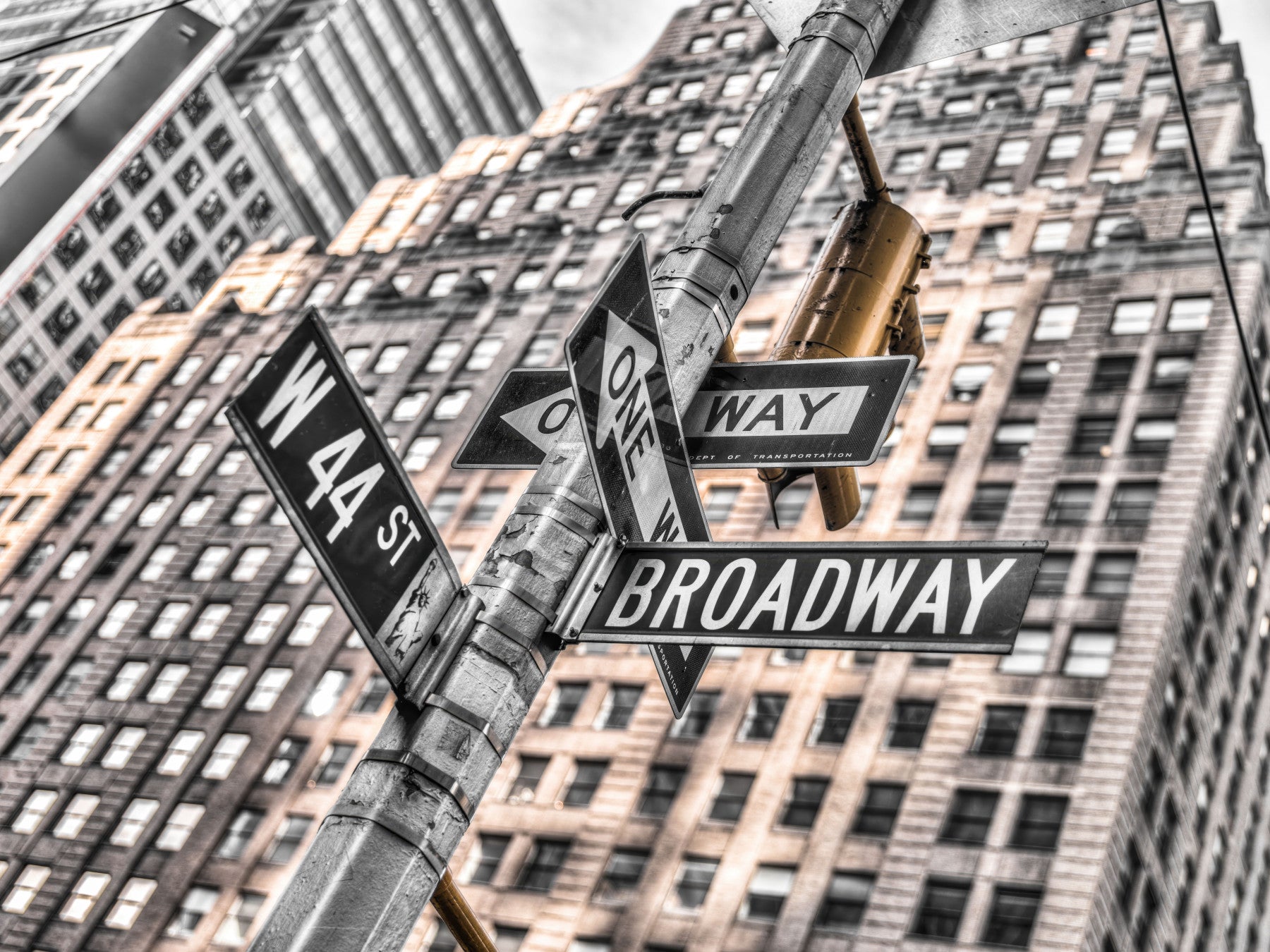W 44 St and Broadway signs, towering skyscraper background, Manhattan view.