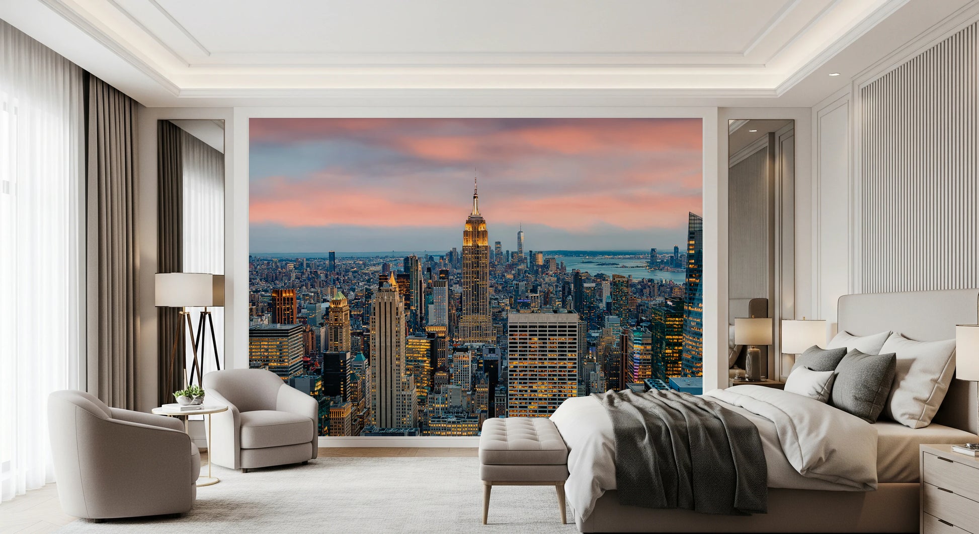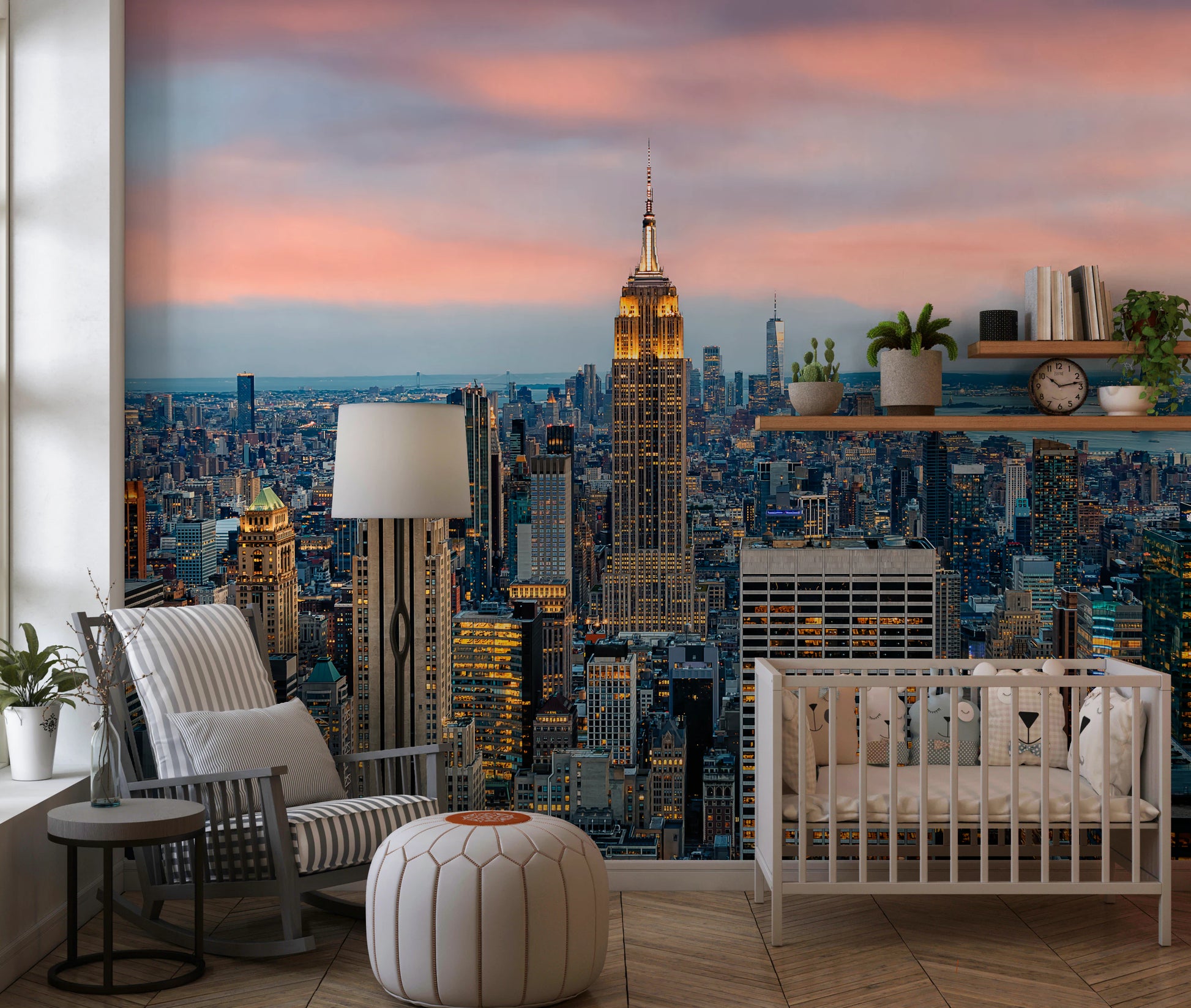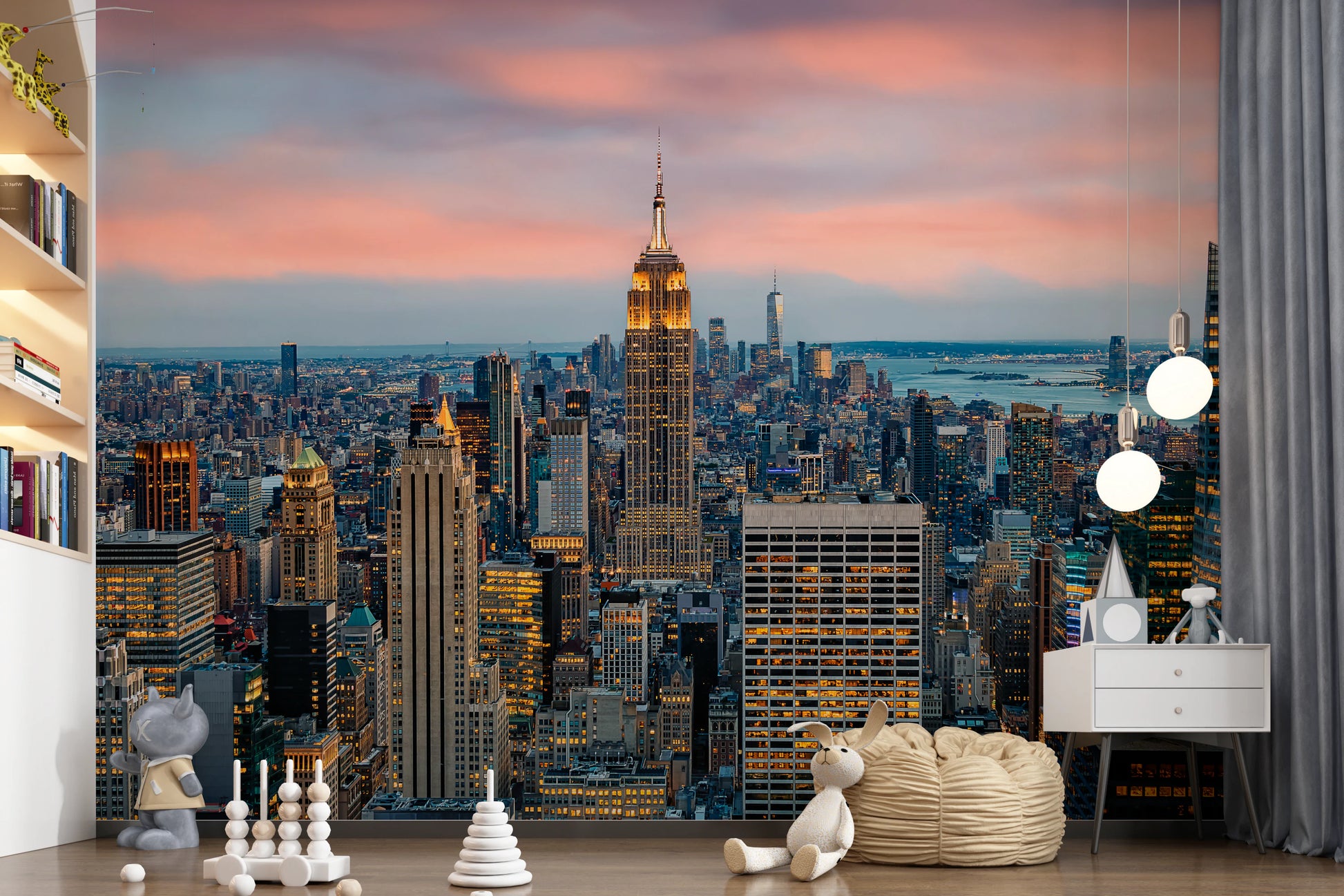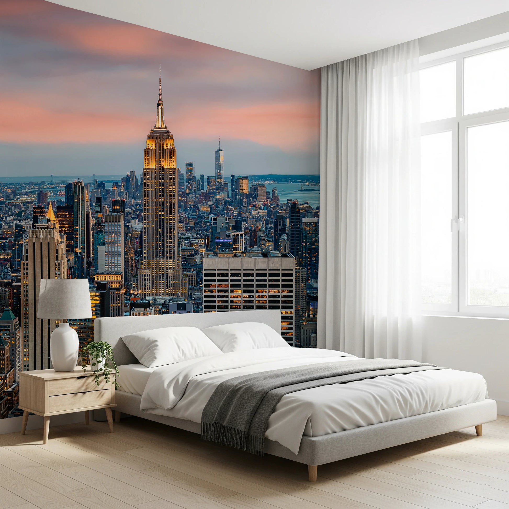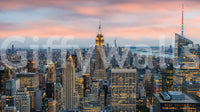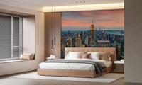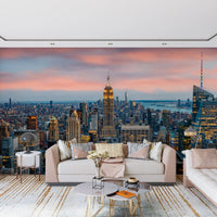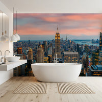 Elevate your space with the striking 'Manhattan Dawn' wallpaper for walls. The breathtaking cityscape captures New York's iconic skyline at twilight. The detailed architectural forms of the buildings stand out against a soft, blush-toned sky. The warm, golden lights of the city offer a beautiful contrast to the cool blues of the distant water. This urban panorama brings a sophisticated and modern vibe to living rooms, offices, or hallways, adding depth and visual interest. This design transforms any interior into a captivating urban sanctuary. The vibrant details and harmonious colours make a lasting impact on your wall décor.