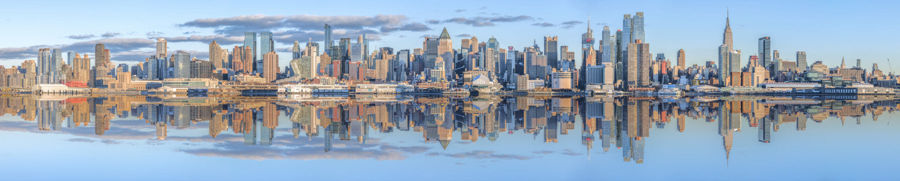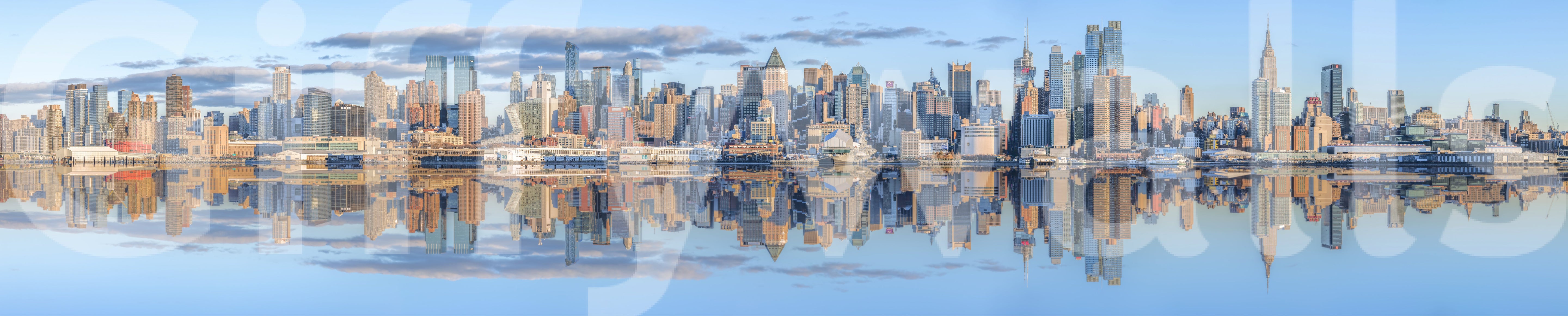 This stunning wallpaper captures the iconic Manhattan skyline reflected perfectly in calm waters. The image presents a breathtaking panoramic view of the city's diverse architecture, from towering skyscrapers to classic buildings, all bathed in the soft light of a clear day. The mirrored effect creates a surreal and captivating visual, enhancing the city's grandeur and adding a touch of ethereal beauty. The serene water acts as a canvas, mirroring the urban landscape with exceptional clarity, offering a double dose of architectural splendor. It's the perfect blend of urban energy and tranquil serenity, making it ideal for those who appreciate modern architecture and find solace in peaceful reflections.