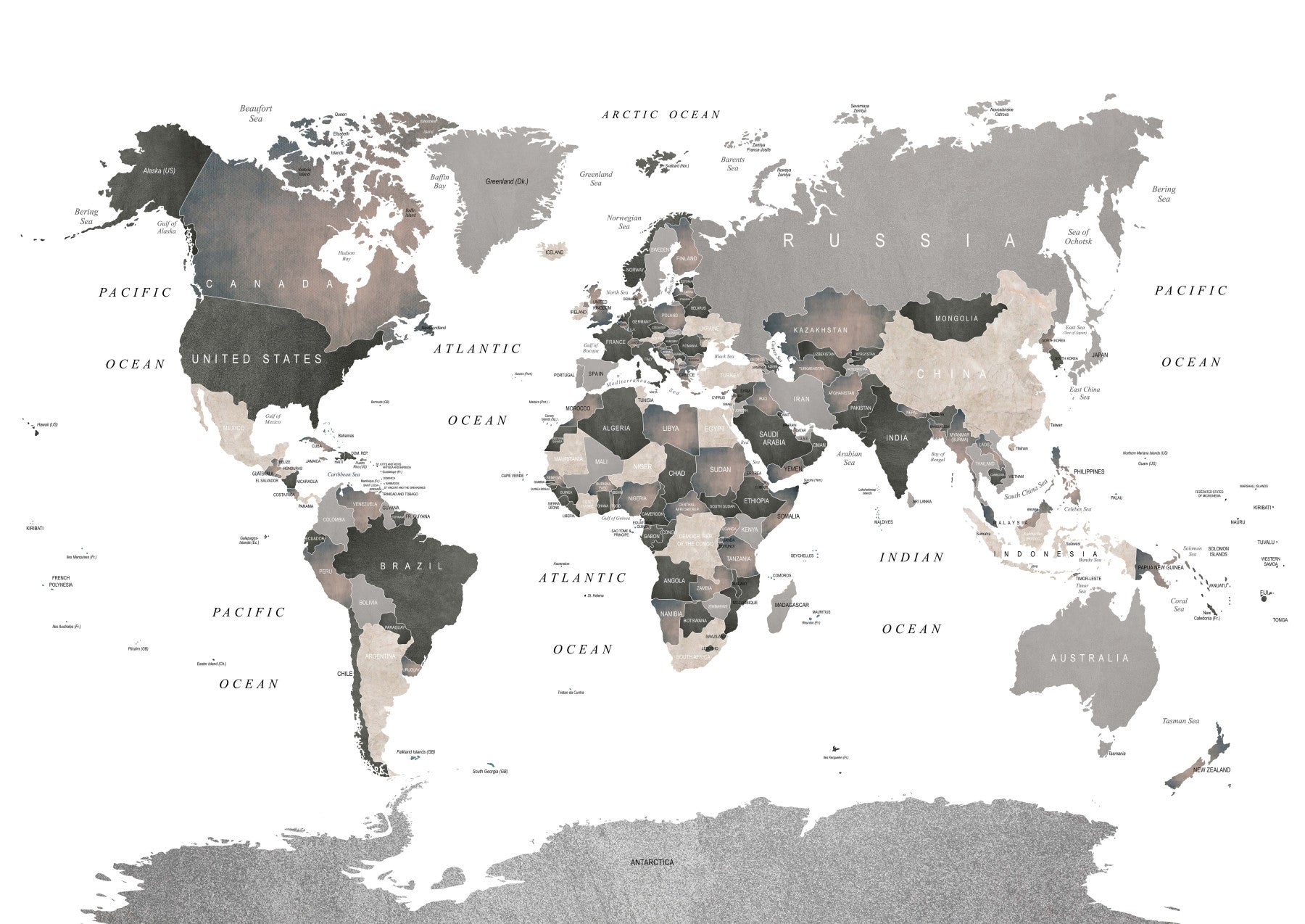 Explore a world map rendered in calming muted tones. This wallpaper showcases a sophisticated grayscale palette, highlighting the continents with subtle variations in shading and texture. The understated color scheme provides a serene backdrop, allowing the geographical details to take center stage. Perfect for minimalist aesthetics, this world map offers a sophisticated and calming visual experience, bringing a touch of elegant cartography to any digital device. Each country is clearly defined, offering a detailed yet restful view of our planet.