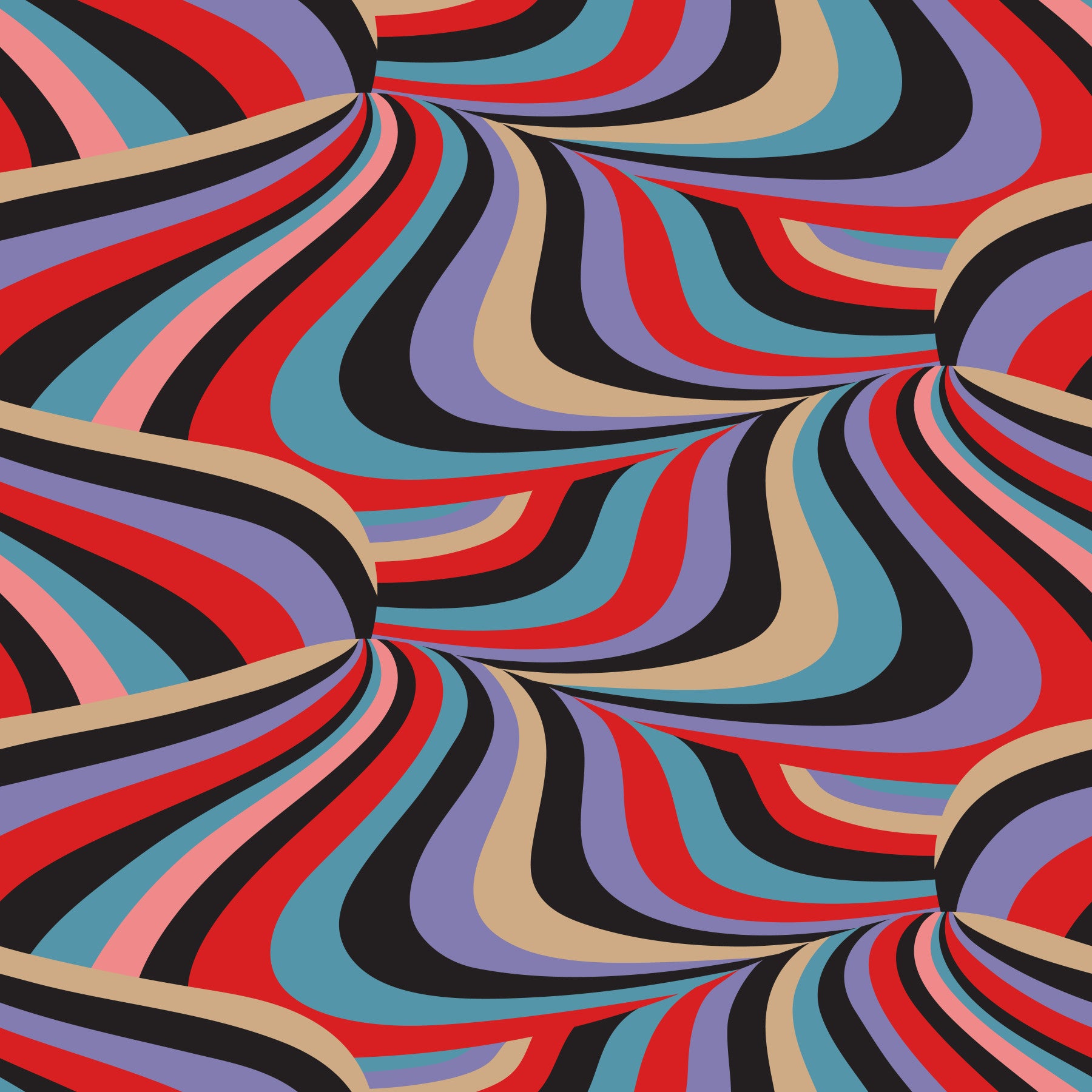 Retro mod groovy swirling marble stripes in a bold bright colour combo of Black, Purple, Red, Baby Blue, Cream and Pink! This pattern design is also available in Other Colourways too! Original wallpaper pattern design by Jackie Tahara of UnBlink Studio.