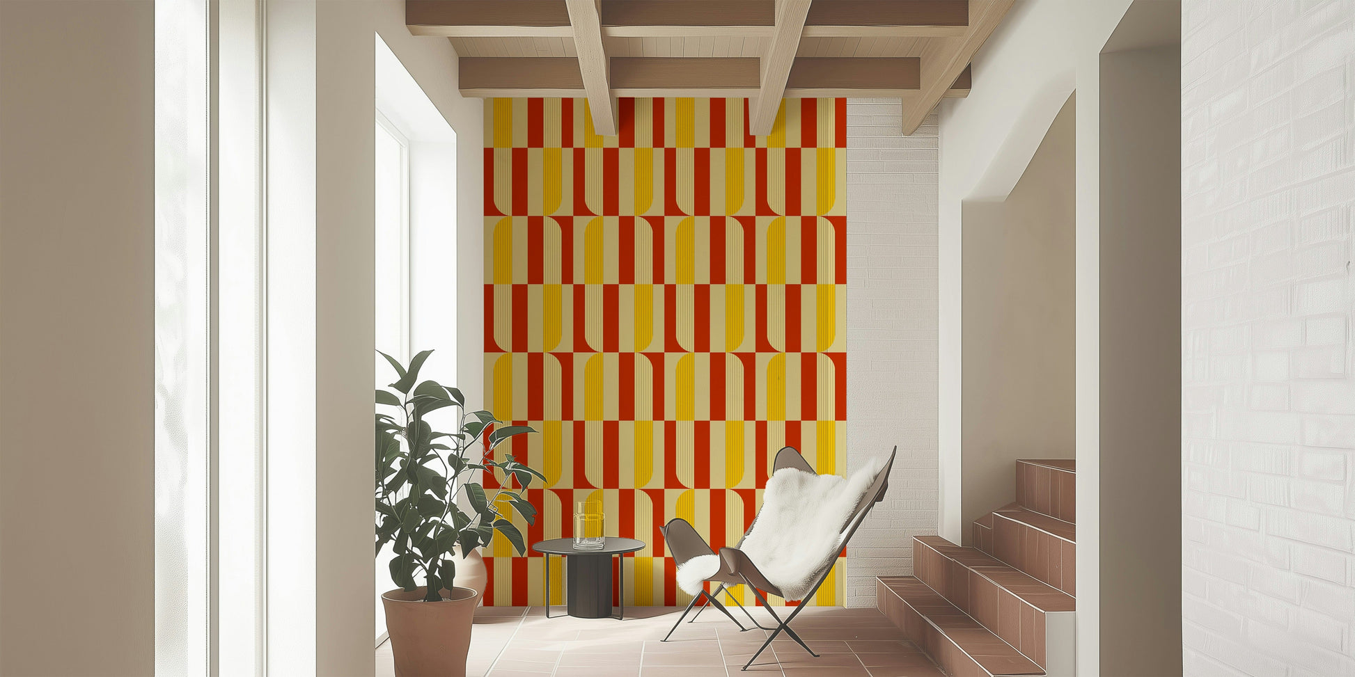 Marigold & Maple: An Abstract Pattern for Your Walls Bring the vibrant warmth of autumn into your home with this stunning Marigold & Maple wallpaper. This abstract design features a striking interplay of deep crimson reds and rich golden yellows, creating a modern and timeless aesthetic. The intricate geometric shapes form a beautiful rhythm across your wall, adding both visual interest and a cosy, inviting feel to any room. Perfect for a feature wall in a living room, bedroom, or dining area, this wallpaper transforms any space with its bold, artistic flair. Its versatile style complements a range of décor, from mid-century modern to classic Art Deco.