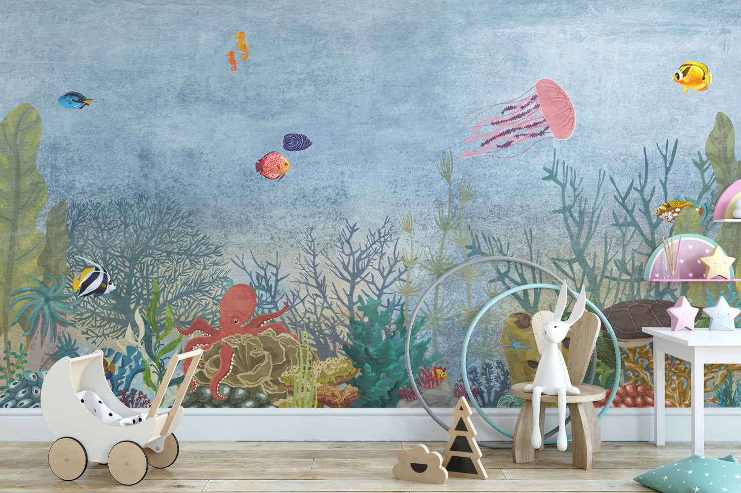 Bring a breathtaking ocean scene into your home with the Marine Life Underwater Wallpaper Mural for walls. Featuring bright fish, an adorable octopus, and a tranquil turtle swimming in a kaleidoscope of corals, this mural is a wonderful representation of an oceanic atmosphere. Be a lover of marine life or an admirer of nature's beauty- this mural will breathe life into your living room or bedroom. Shop now and enjoy the soothing effect of ocean views in your home with free shipping!