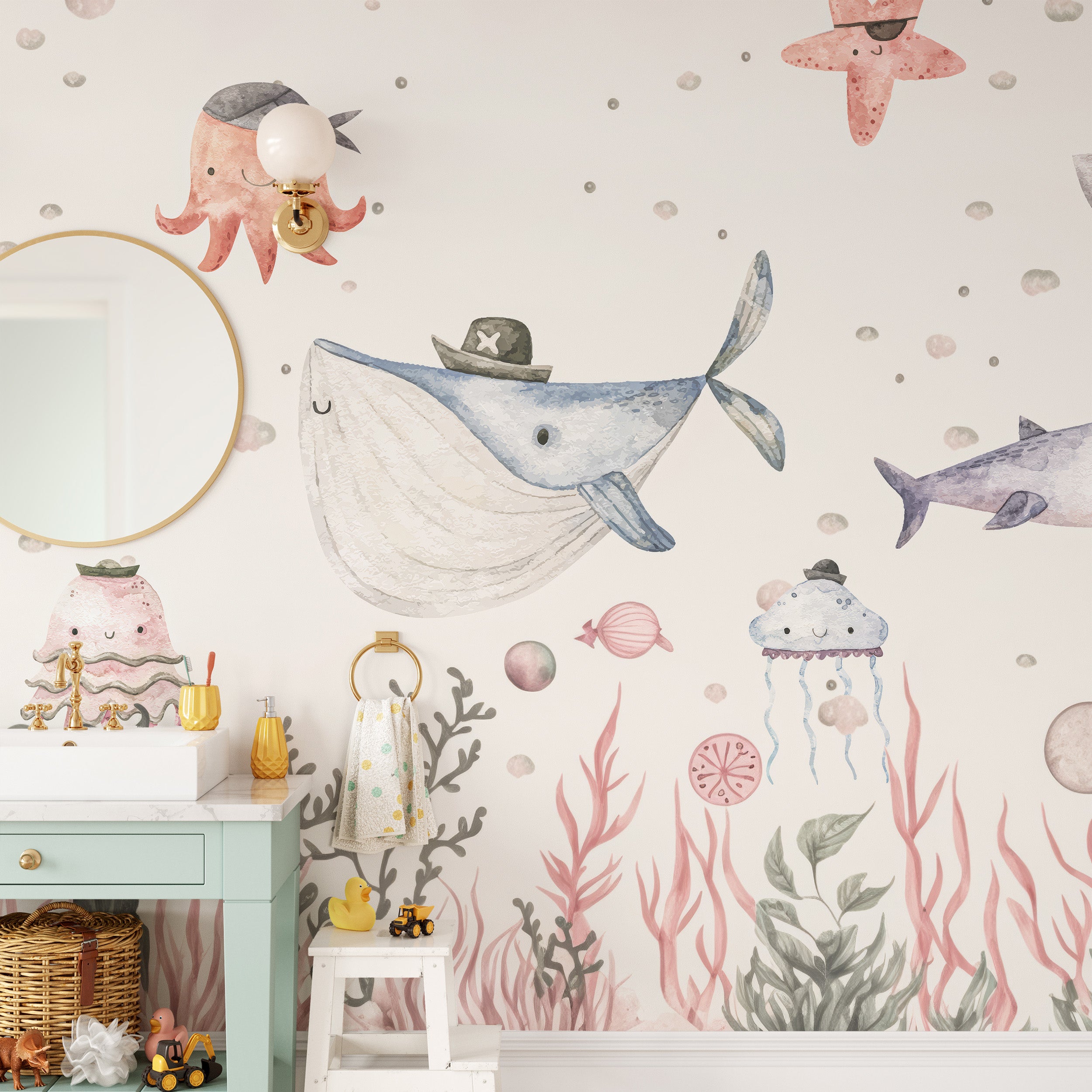 Brighten the nursery with our nursery wallpaper for the maritime mischief aquarium mural! This joyful mural invites your child to a world of smiling pirate fish, dapper whales, and stylish stingrays. Each sea creature is a friend, beckoning young imaginations to play and explore the depths of the ocean from the comfort of home. It's more than just a scene on the wall, it’s a conversation starter, a playful companion, and a backdrop to childhood adventures. Make a simple change that brings a wave of storytelling and joy to your nursery. Don't just cover walls, inspire your child with a sea of tales!