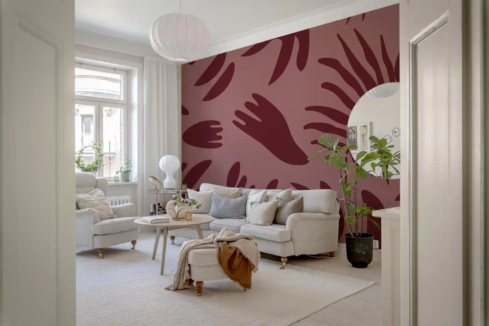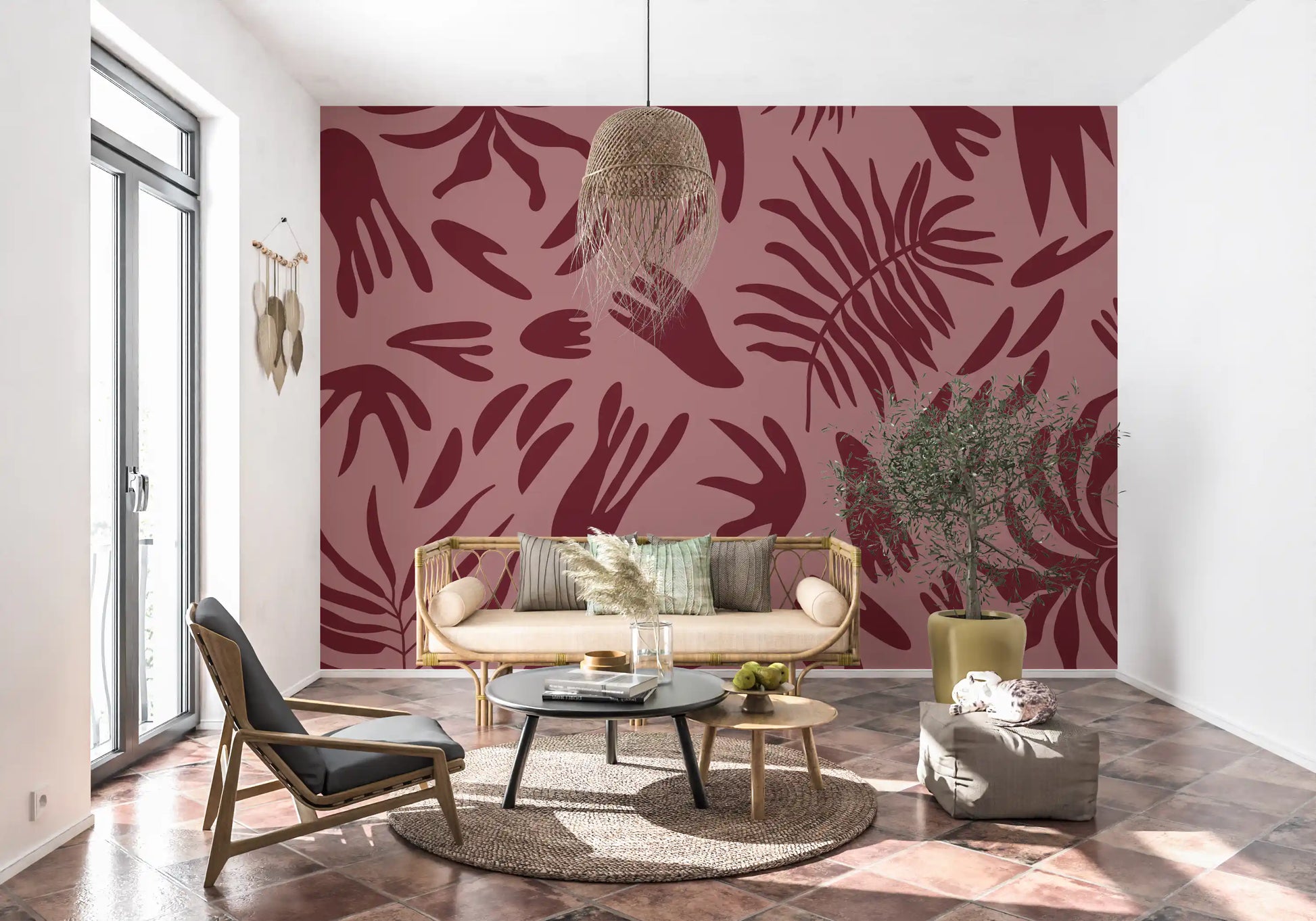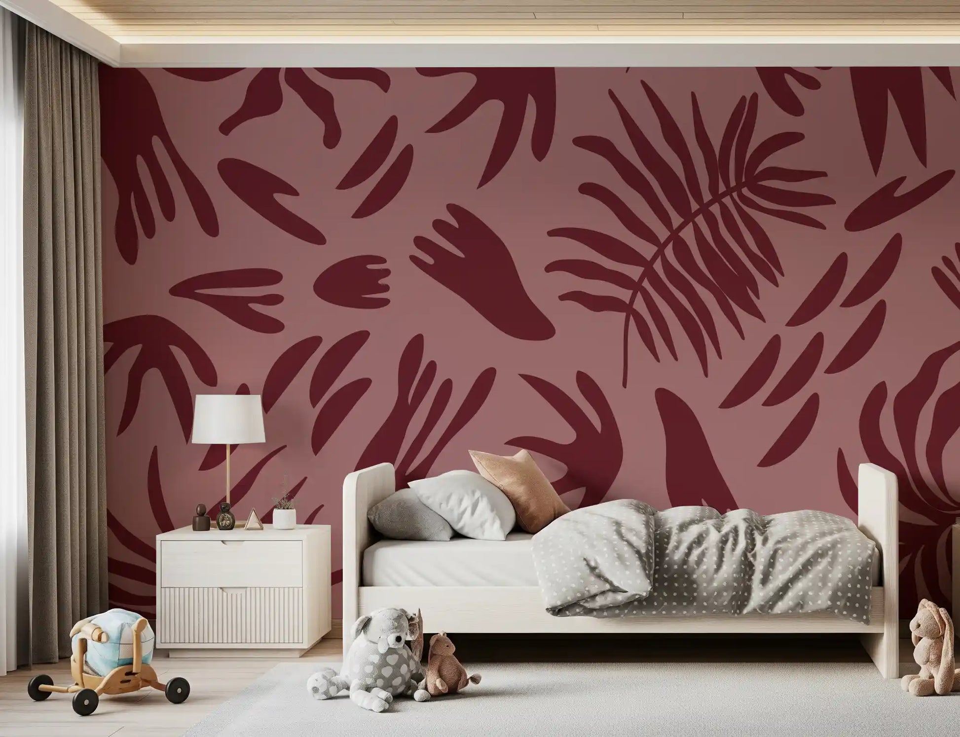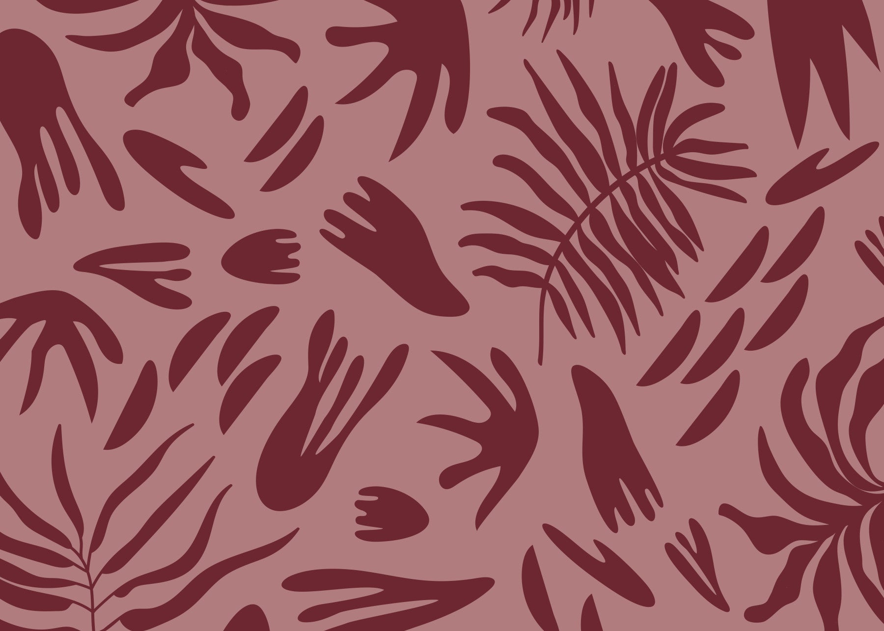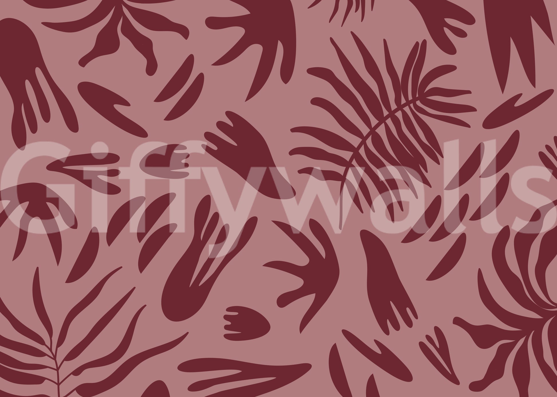Introduce a serene, sophisticated ambience to your living spaces with this distinctive wallpaper for walls. It features a captivating pattern of abstract botanical shapes in varying organic forms, reminiscent of large leaves and delicate fronds. The minimalist design utilises solid, flat silhouettes that create a modern, artful impression. A rich, deep maroon hue defines the flowing shapes, set against a warm, dusky pink background. This analogous colour palette creates a harmonious and inviting atmosphere, adding subtle depth and an earthy warmth to any room. This versatile design works beautifully in a contemporary living room, a tranquil bedroom, an elegant dining area, or a stylish home office, effortlessly complementing modern, bohemian, or eclectic interior styles.
