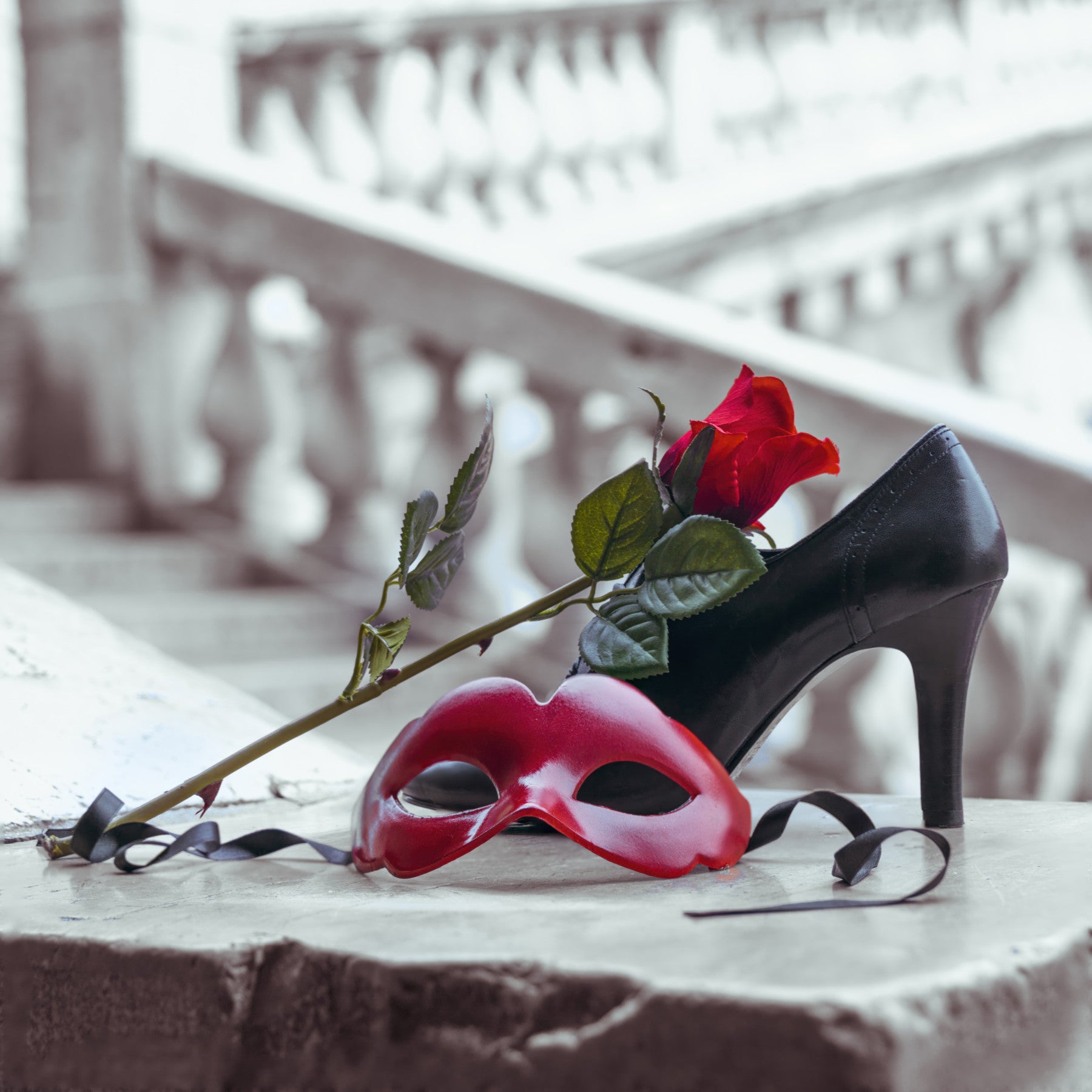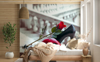 Venetian mask and high heel shoe with red rose, Rialto bridge, Venice, Italy. Elevate the sophistication of your interior spaces with this refined wallpaper for walls. The stylized composition presents a red rose, a classic stiletto, and a crimson mask, invoking intrigue. A dark ribbon adds drama against the backdrop. The muted, almost monochromatic, palette creates a timeless feel. This design integrates seamlessly into a dressing room, bedroom, or a chic hallway, complementing modern and classic aesthetics alike. Install it in a downstairs loo to transform a small space. Consider this luxurious art piece to bring an air of mystery.