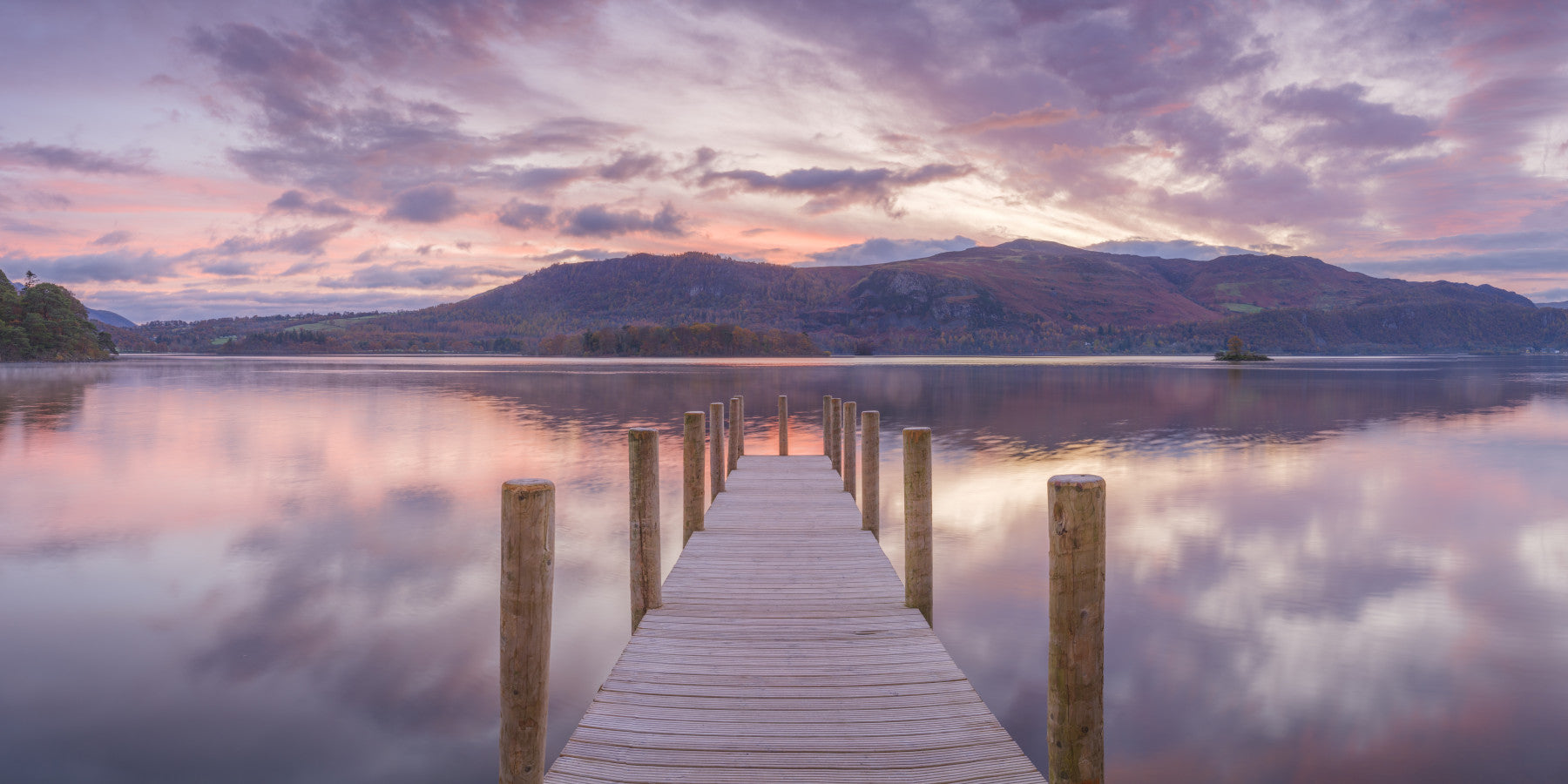 Derwentwater pier, lake district. Capture the ethereal beauty of dusk with this serene wallpaper. The scene features a wooden pier leading into a tranquil lake, reflecting a sky awash in mauve and subtle pinks. Imagine the calming effect this image brings. Consider this wallpaper for walls in areas where you seek relaxation, such as bedrooms or studies. The horizontal lines of the dock and soft color palette extend spaces. It pairs well with neutral palettes and natural textures for a cohesive design.
