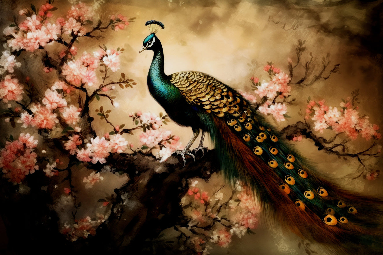 Bold floral wallpaper with peacock motif and rich multicolor foliage