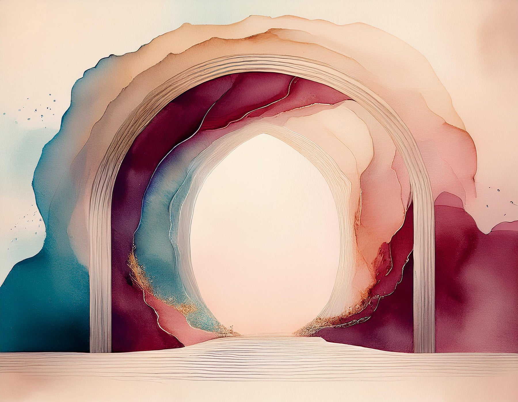 This abstract wallpaper evokes a sense of tranquil contemplation. The fluid, watercolor-like forms in muted jewel tones of teal, burgundy, and blush pink create a dreamy, ethereal atmosphere. A subtle golden shimmer adds a touch of luxurious elegance, while the architectural archway suggests a pathway to inner peace or a hidden sanctuary. The overall effect is calming and meditative, perfect for creating a serene space in any room.