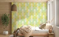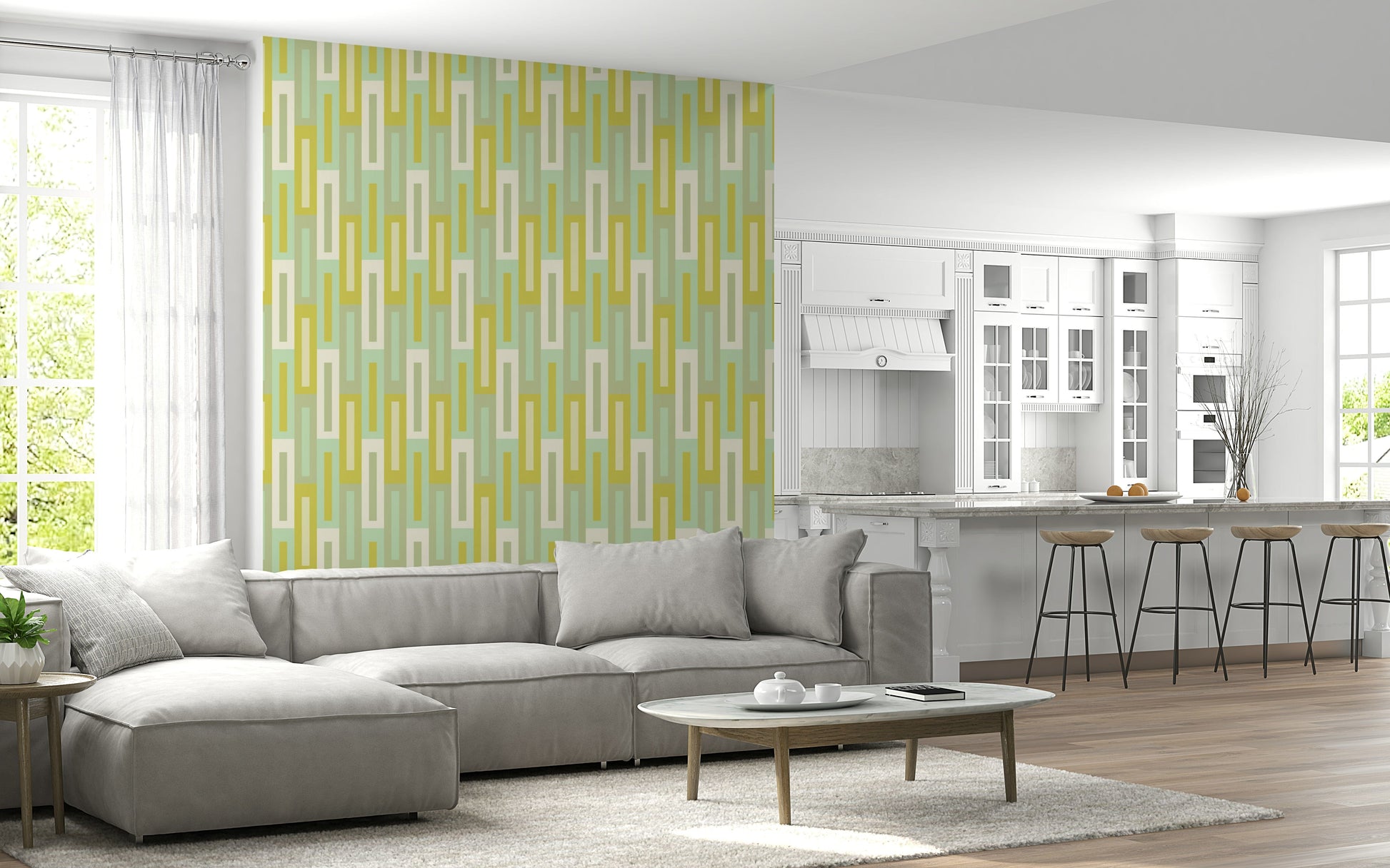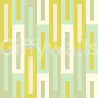 Transform your space with this intriguing geometric design. The wallpaper features a maze-like pattern with vertical rectangular shapes and soft colour blocks. Pastel green, yellow and beige hues bring a calming effect. Ideal for modern living rooms, serene bedrooms, or hallway designs. This abstract wallpaper for walls elevates any room with a blend of mid-century style and adds a touch of subtle sophistication, ensuring a pleasant interior.