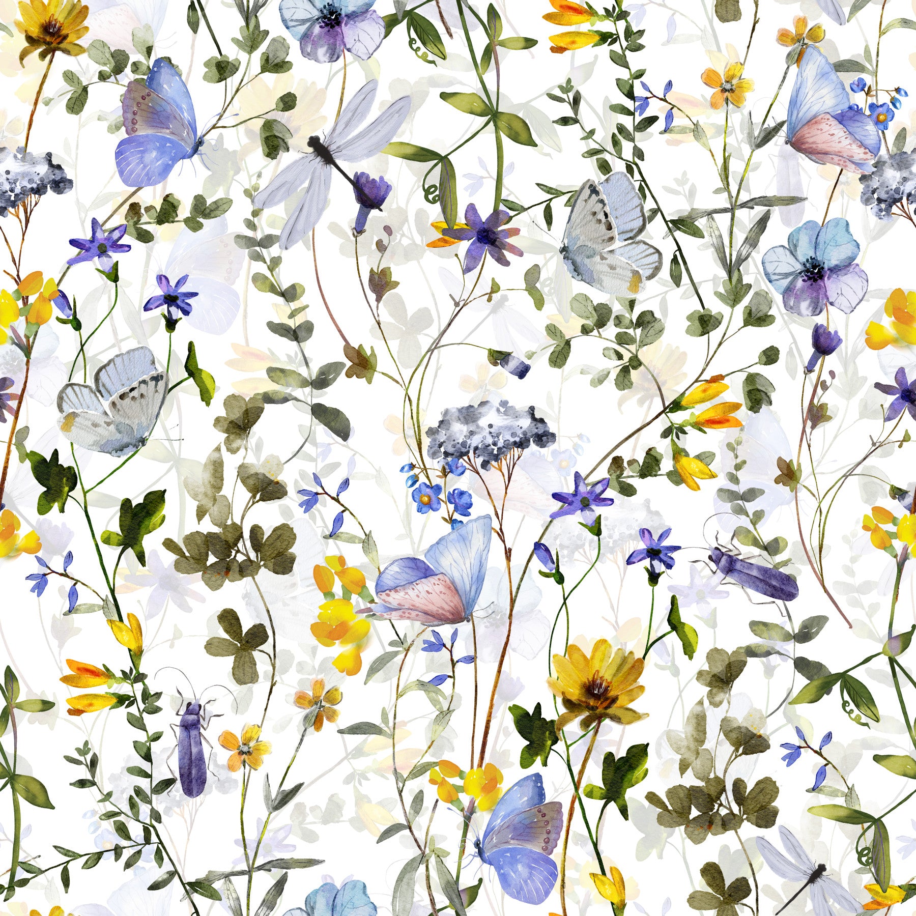 Watercolor Meadow Butterfly Whispers Garden, garden floral print accent wallpaper.
