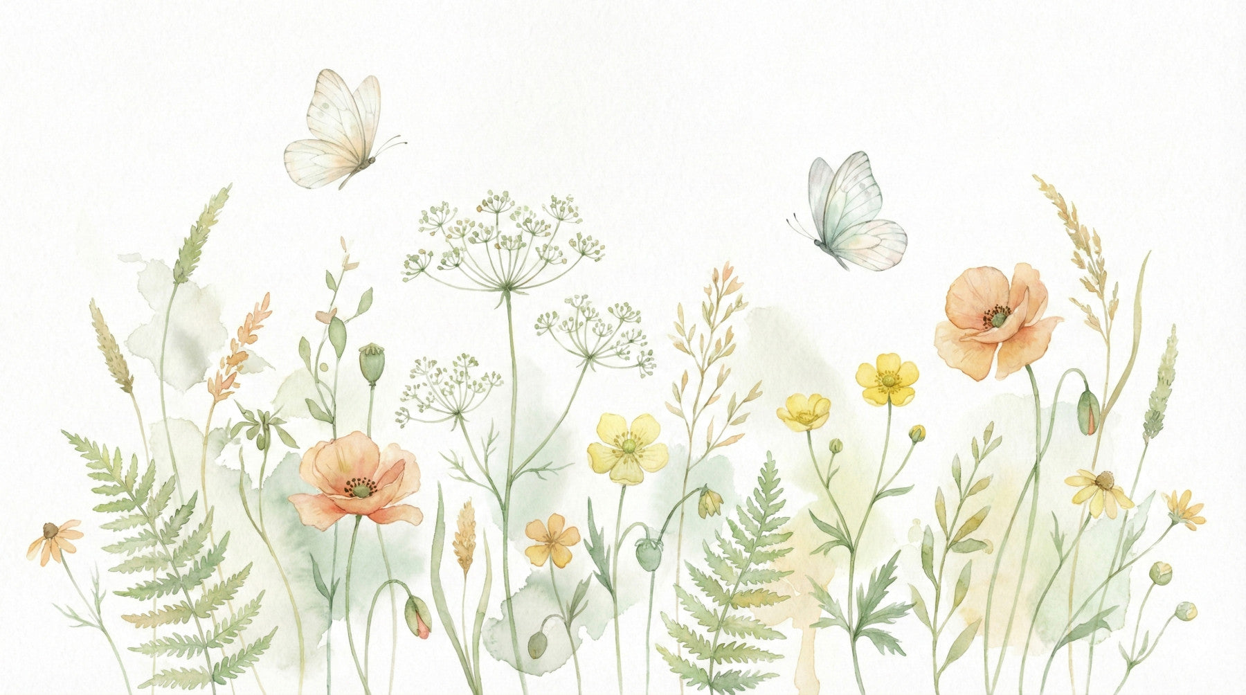 Delicate wild grass and floral wallpaper for a calm master bedroom.