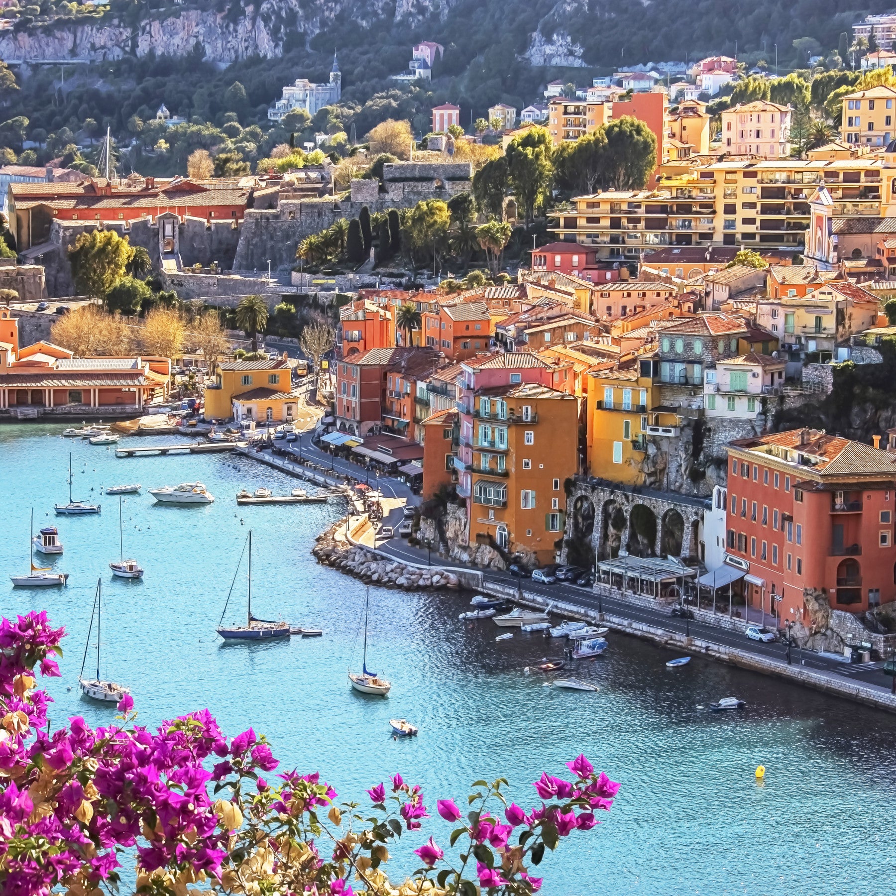 Escape to the idyllic shores of the French Riviera with this breathtaking wallpaper. The image showcases a vibrant coastal town, where colorful buildings nestle against a dramatic hillside overlooking a sparkling turquoise harbor. Sailboats gently bob on the water, creating a serene scene. The bright, cheerful color palette and sun-drenched atmosphere evoke a sense of joy and tranquility. Perfect for adding a touch of Mediterranean magic and elegance to any room, this wallpaper transports you to a world of sun-kissed charm and coastal beauty. The inclusion of vibrant bougainvillea adds a touch of natural beauty and color to an already stunning vista.