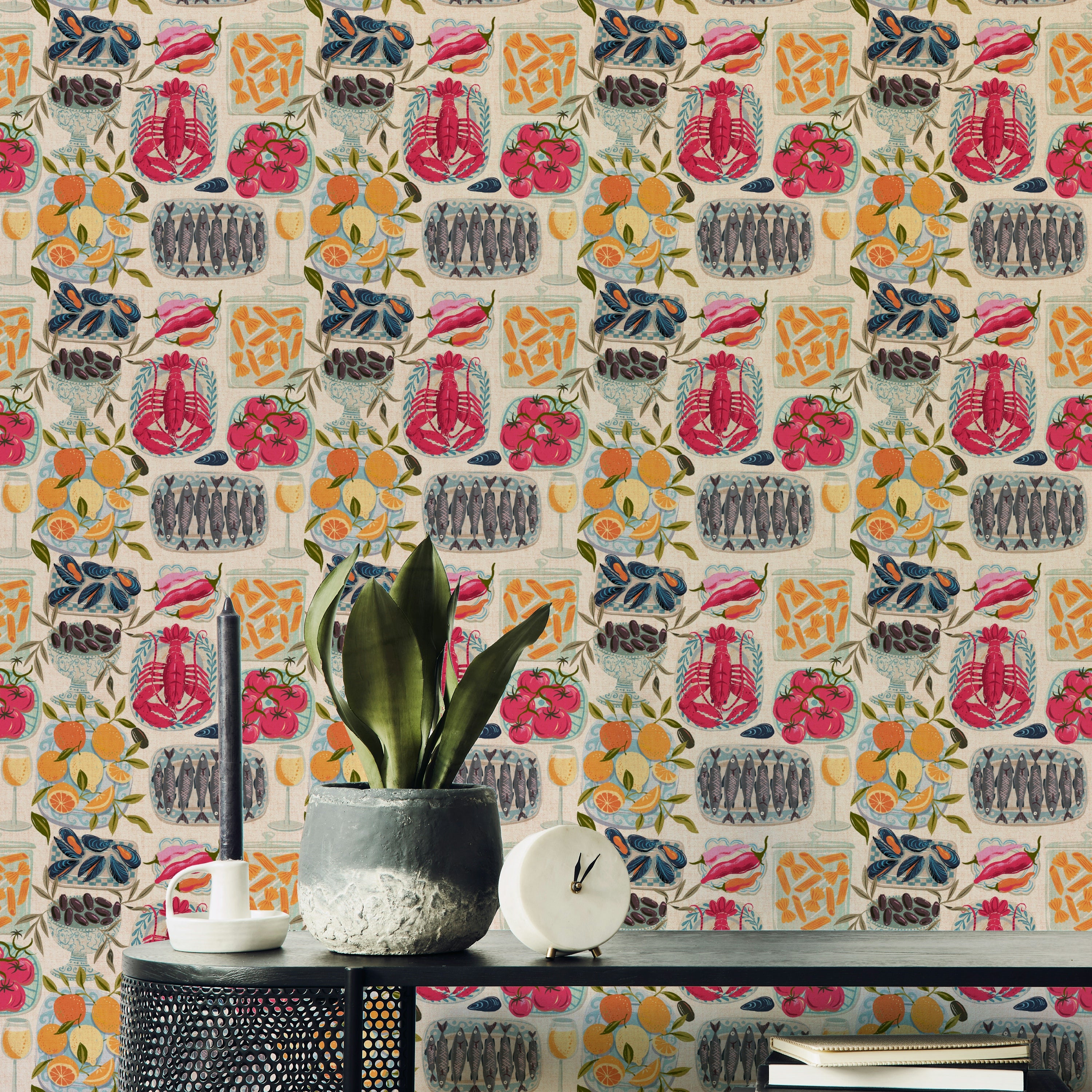 A vibrant and inviting Mediterranean feast awaits! This wallpaper showcases a delightful mise en place, bursting with the colors and flavors of the sun-drenched coast. From succulent lobster and glistening mussels to ripe tomatoes and juicy oranges, each element is artfully arranged on charmingly patterned plates. A bowl of Kalamata olives and a glass of crisp white wine complete the scene, evoking a sense of warmth, hospitality, and effortless Mediterranean elegance. The textured, painterly style adds a rustic charm, perfect for kitchens, dining rooms, or any space yearning for a taste of the Mediterranean lifestyle.