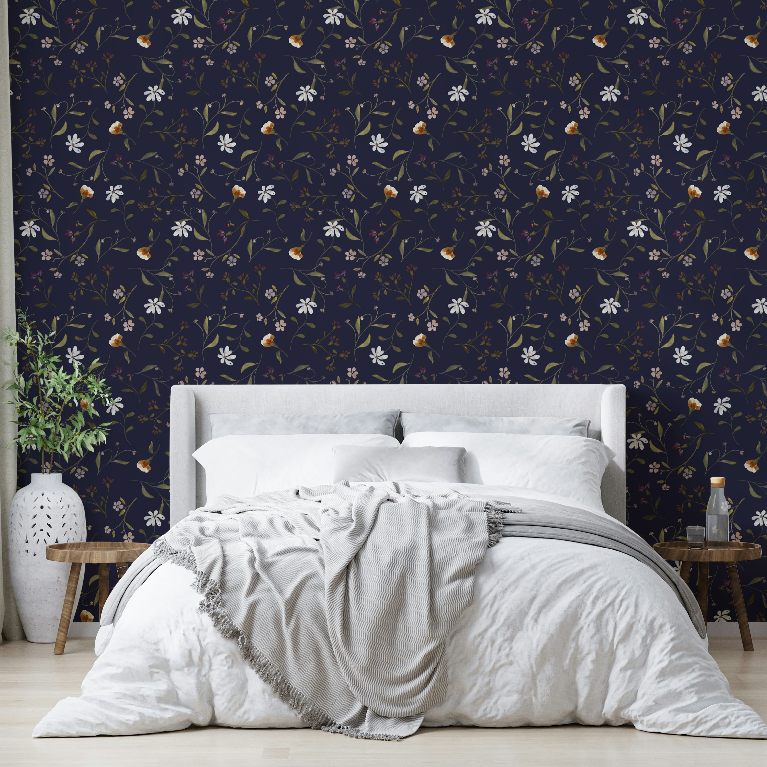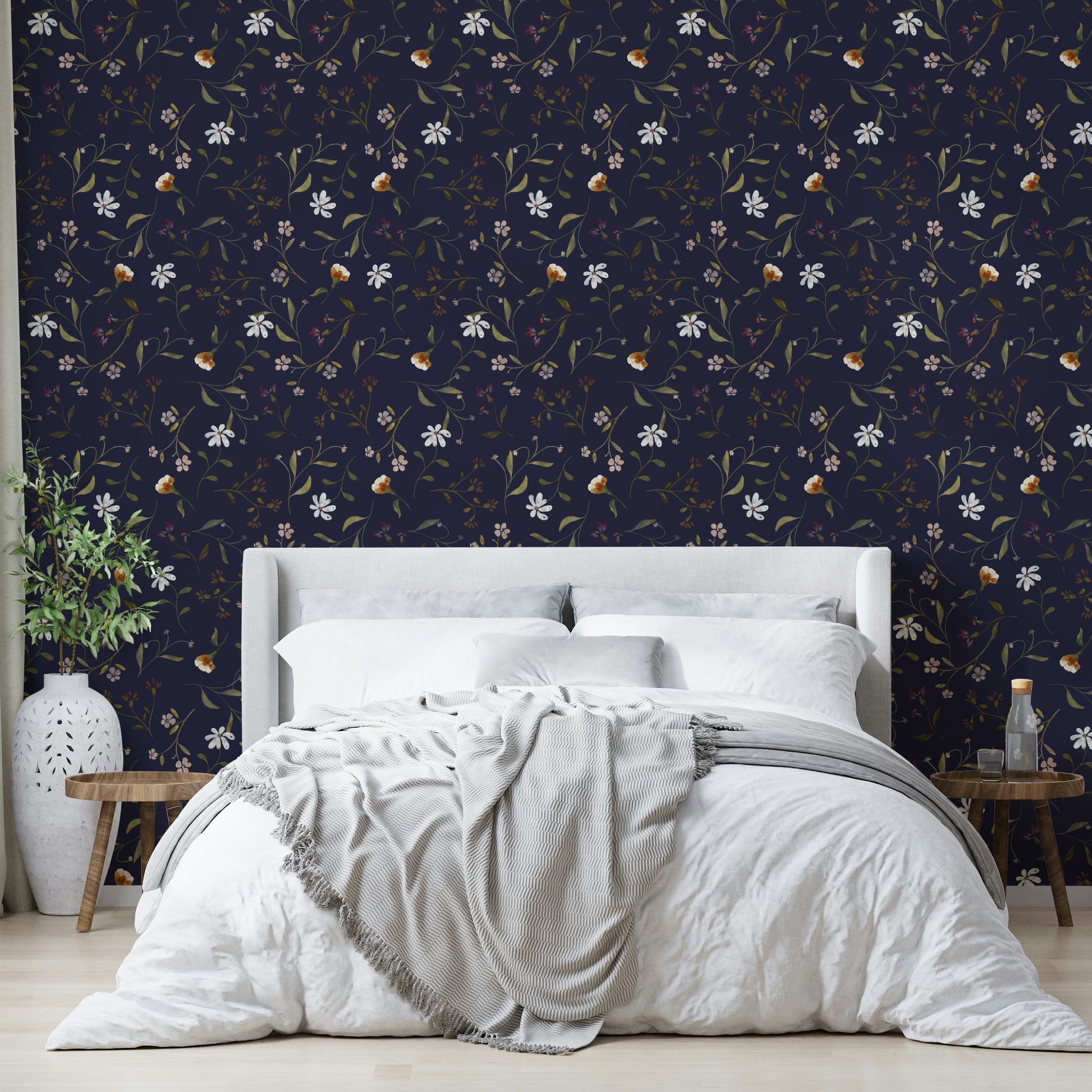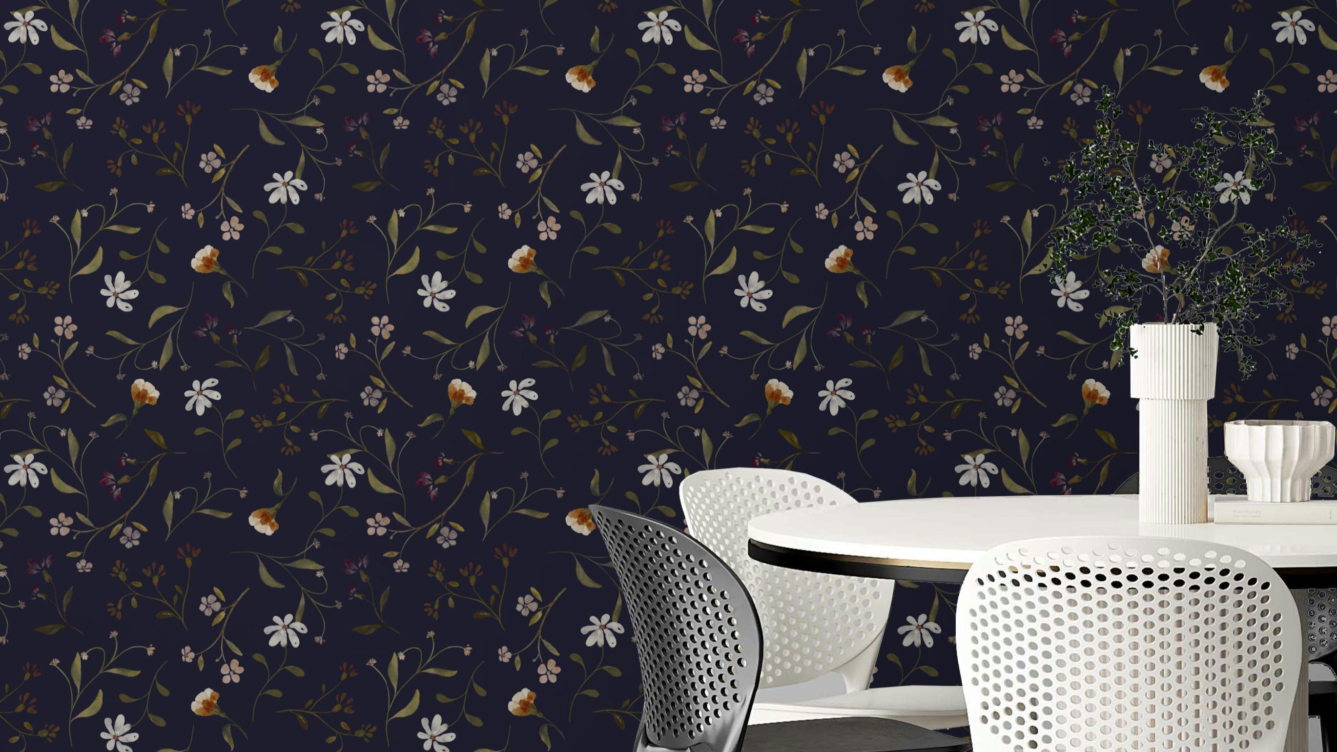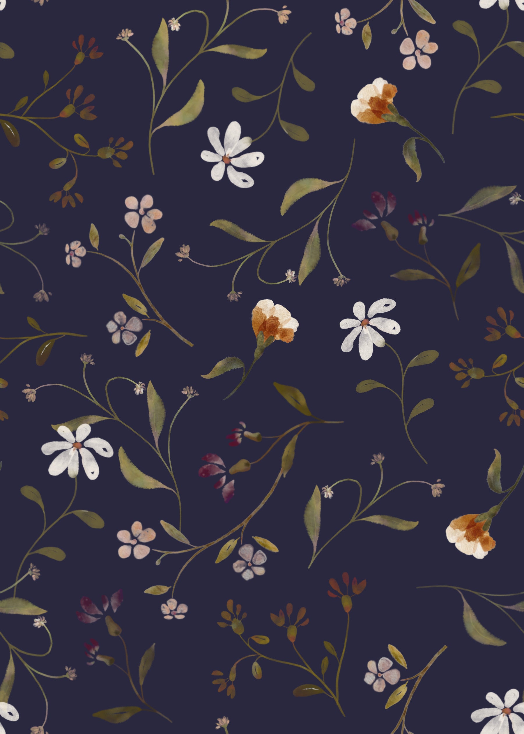 Embrace the tranquil beauty of 'Memories in Petals Wallpaper Nocturne'. This captivating design features a midnight-blue backdrop adorned with delicate watercolor blossoms in soft whites, warm oranges, and deep burgundies. Intricate floral stems intertwine, creating a sense of gentle movement and nostalgic charm. The muted color palette and ethereal floral motifs evoke a sense of quiet remembrance, perfect for creating a serene and peaceful atmosphere on your digital devices. Let the soft glow of these painted petals transport you to a place of calm reflection.