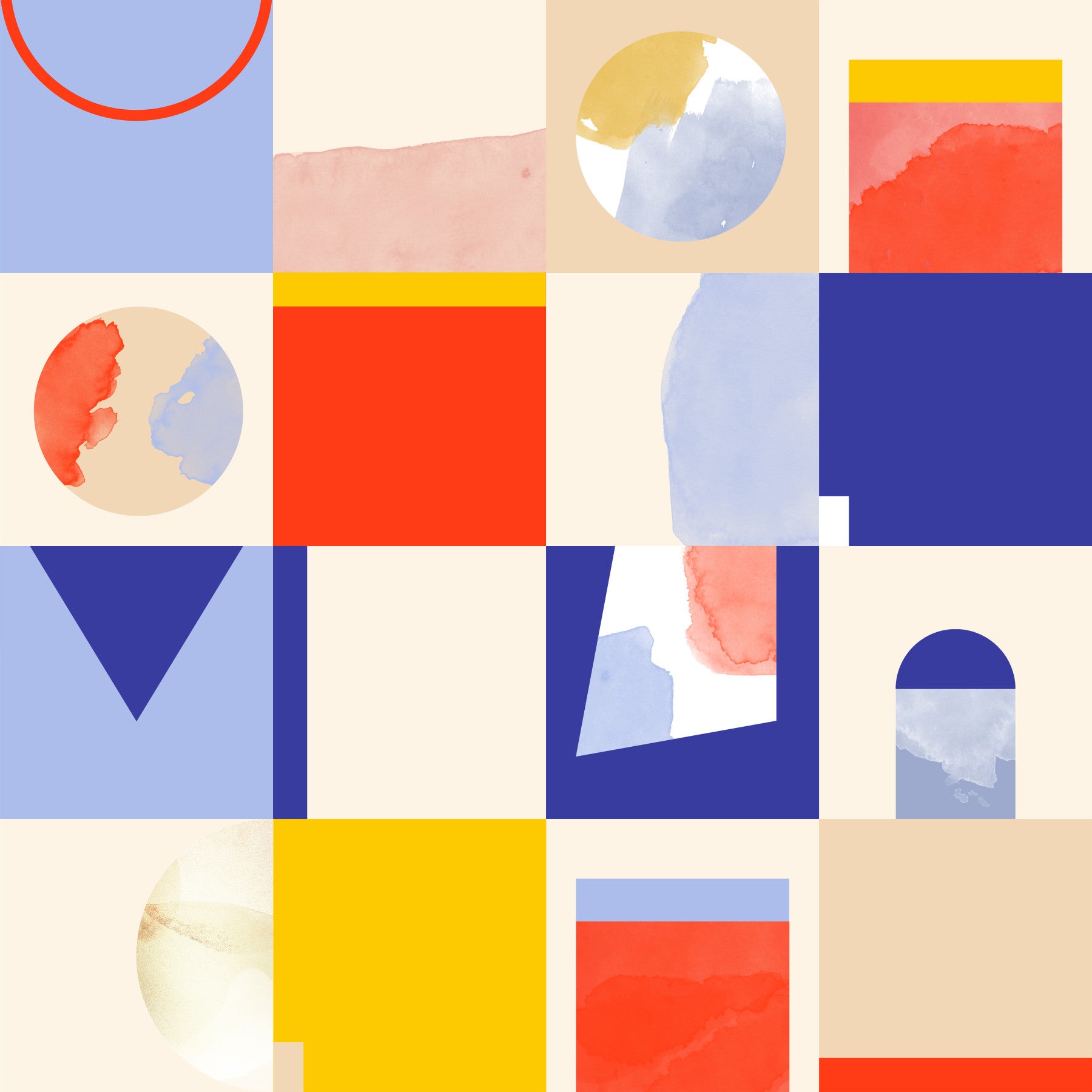 Meraviglia 04 is a stunning abstract wallpaper featuring a captivating interplay of geometric shapes and watercolor textures. Bold blocks of vibrant red, sunny yellow, and serene blue are artfully arranged, creating a sense of playful order. Subtle watercolor washes in complementary shades add depth and visual interest, enhancing the overall harmonious aesthetic. The contrasting colors and shapes generate a dynamic energy, yet maintain a calm and sophisticated atmosphere. This design seamlessly blends modern minimalism with artistic expression, offering a visually striking and uniquely pleasing wallpaper experience.