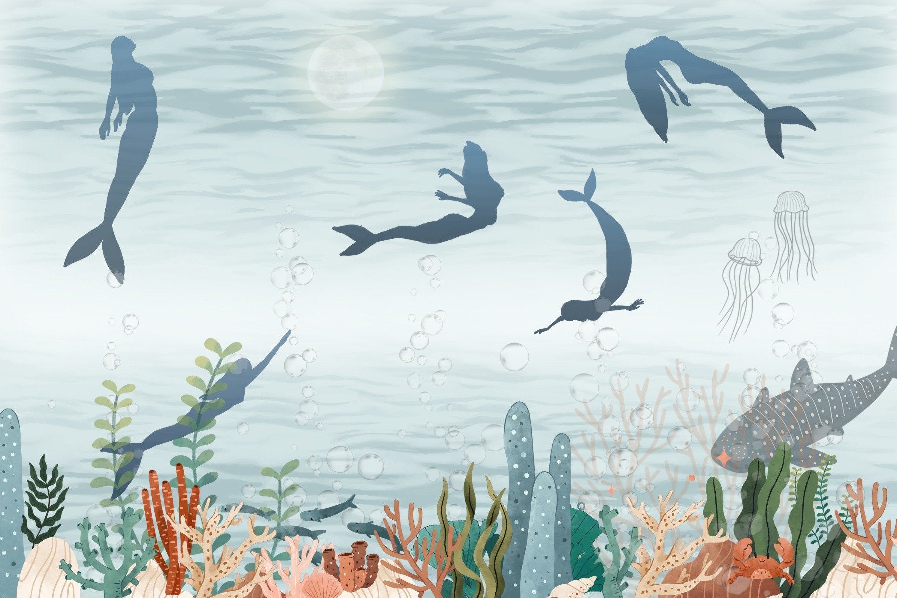 Dive deep into the ocean's embrace with the mermaid whispers ocean mural. This stunning ocean wallpaper draws you into an ethereal world beneath the waves, where mermaids glide gracefully among the coral and frolic with the fishes. Every inch of this mural teems with the vibrant life of the sea, from the gentle jellyfish to the playful seals, all under the watchful eye of the moon. It's perfect for anyone looking to add a touch of mystery and marine magic to their walls. The subtle colors and gentle motion captured in the design bring a calm yet dynamic energy to any room, making it a favorite for bedrooms and bathrooms alike.