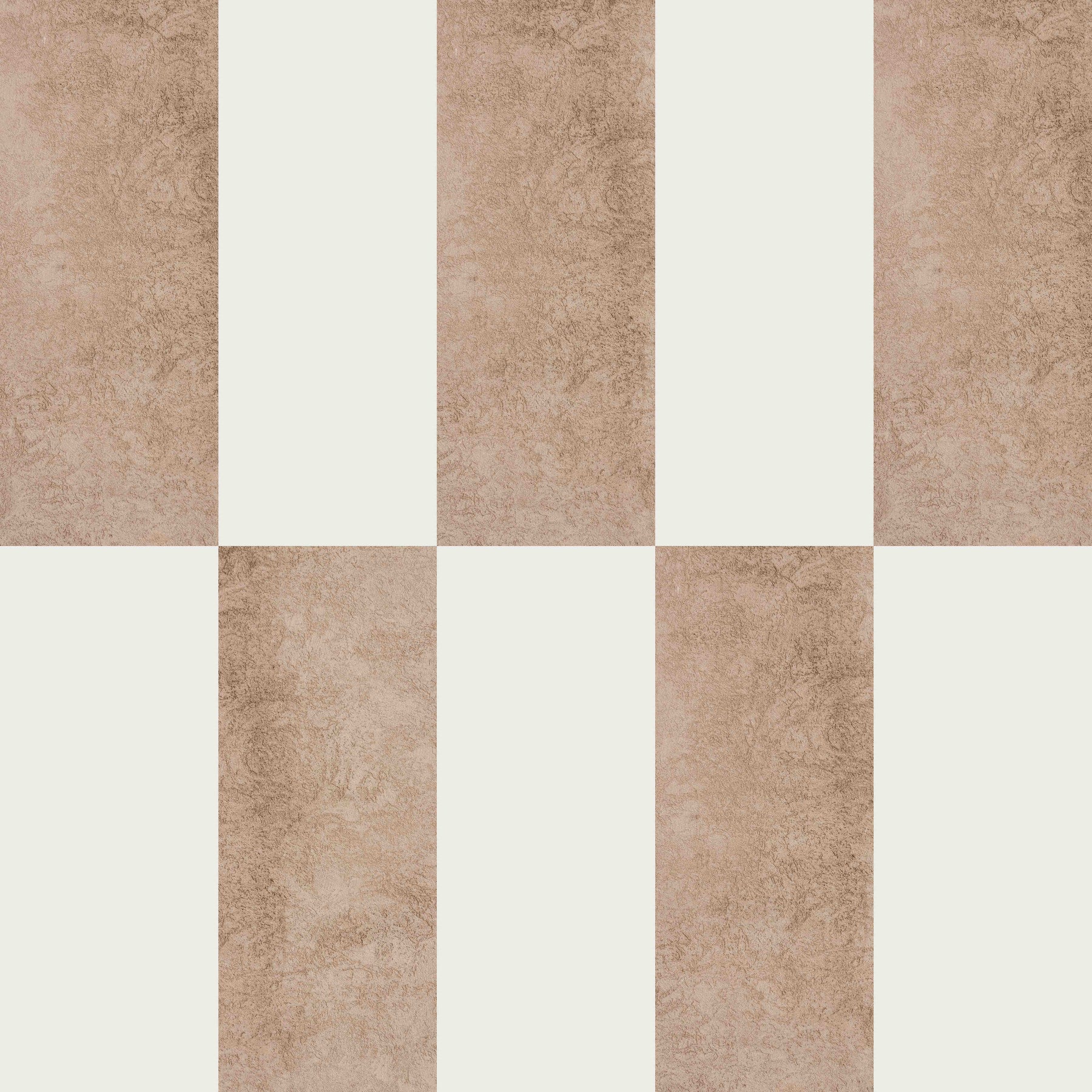 Mescolanza 19 presents a harmonious blend of textures and tones in a structured format. Vertical stripes of a subtly textured, light brown reminiscent of sun-baked earth alternate with fields of soft, creamy white. The interplay creates a sophisticated yet organic feel, evoking a sense of calm and groundedness. The tactile quality of the brown sections contrasts beautifully with the smooth simplicity of the white, offering a visual depth that is both modern and timeless. This wallpaper adds a touch of understated elegance to any space, bringing a natural warmth with its earthy palette.