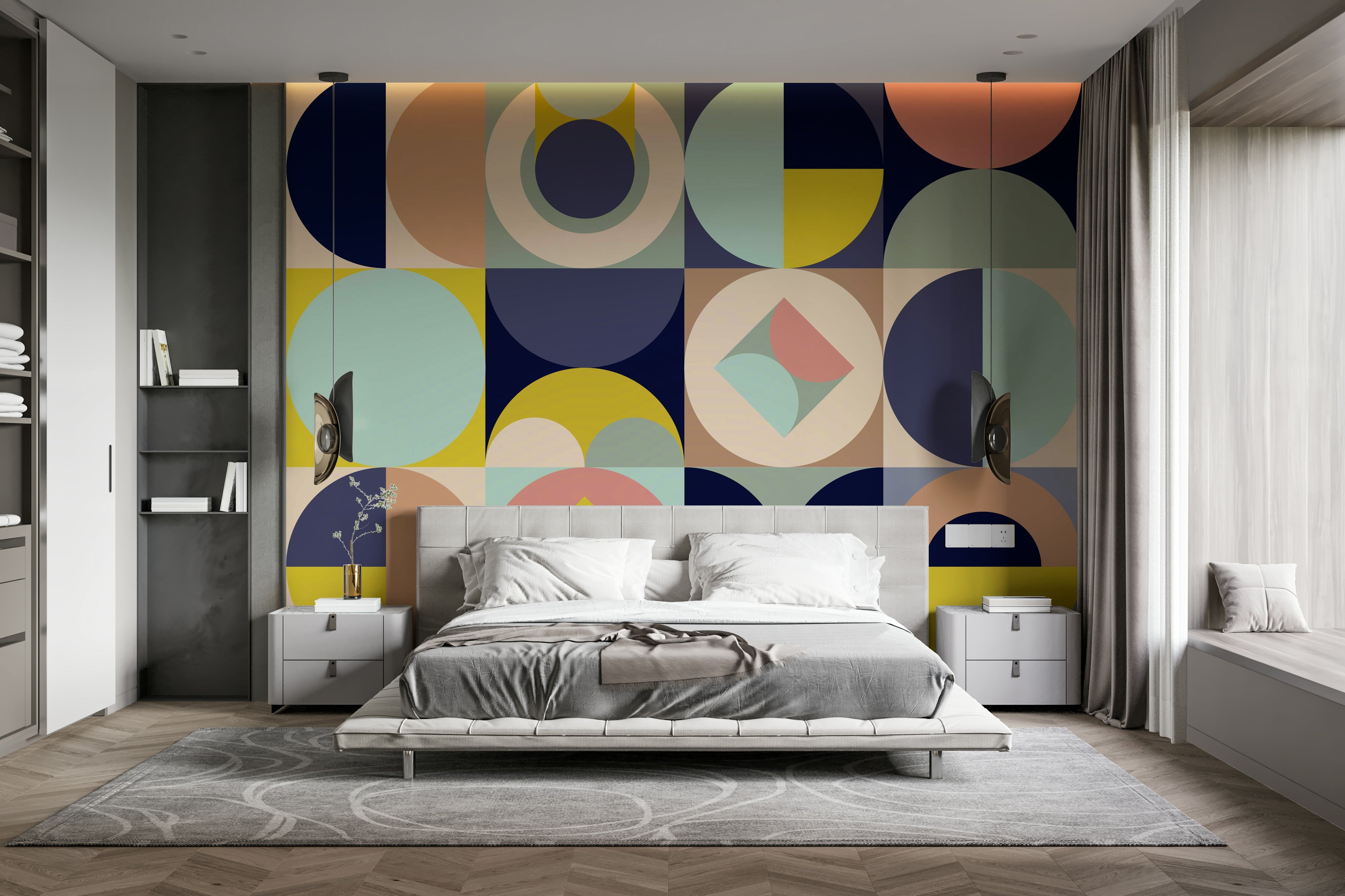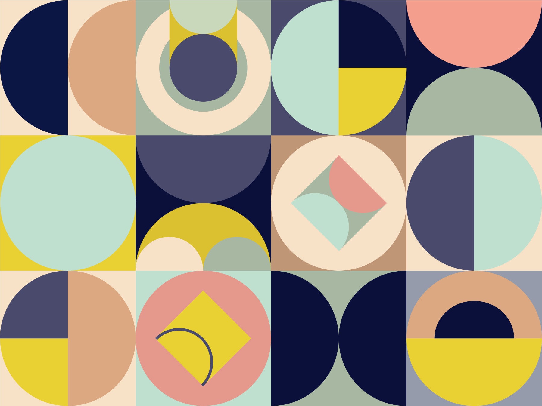 Mescolanza Alt V3 is a vibrant and sophisticated geometric wallpaper. A playful medley of circles, semi-circles, and squares in a muted yet striking palette of dusty rose, pale mint, deep navy, and sunny yellow creates a visually captivating design. The carefully balanced arrangement of shapes evokes a sense of calm order amidst a dynamic composition, offering a modern and elegant aesthetic perfect for any digital device. This iteration refines the original Mescolanza design, showcasing a more subtle yet impactful arrangement of its signature geometric elements.