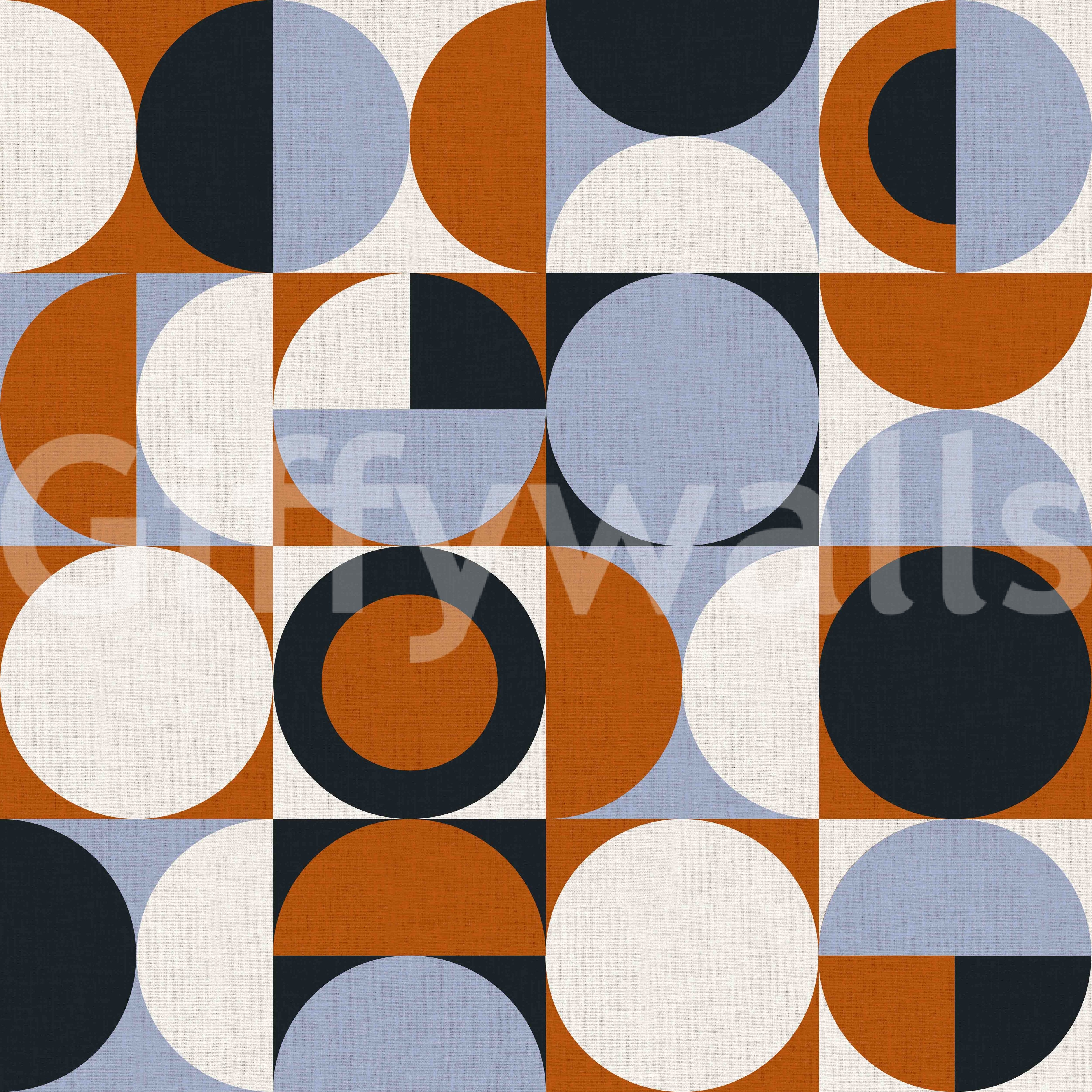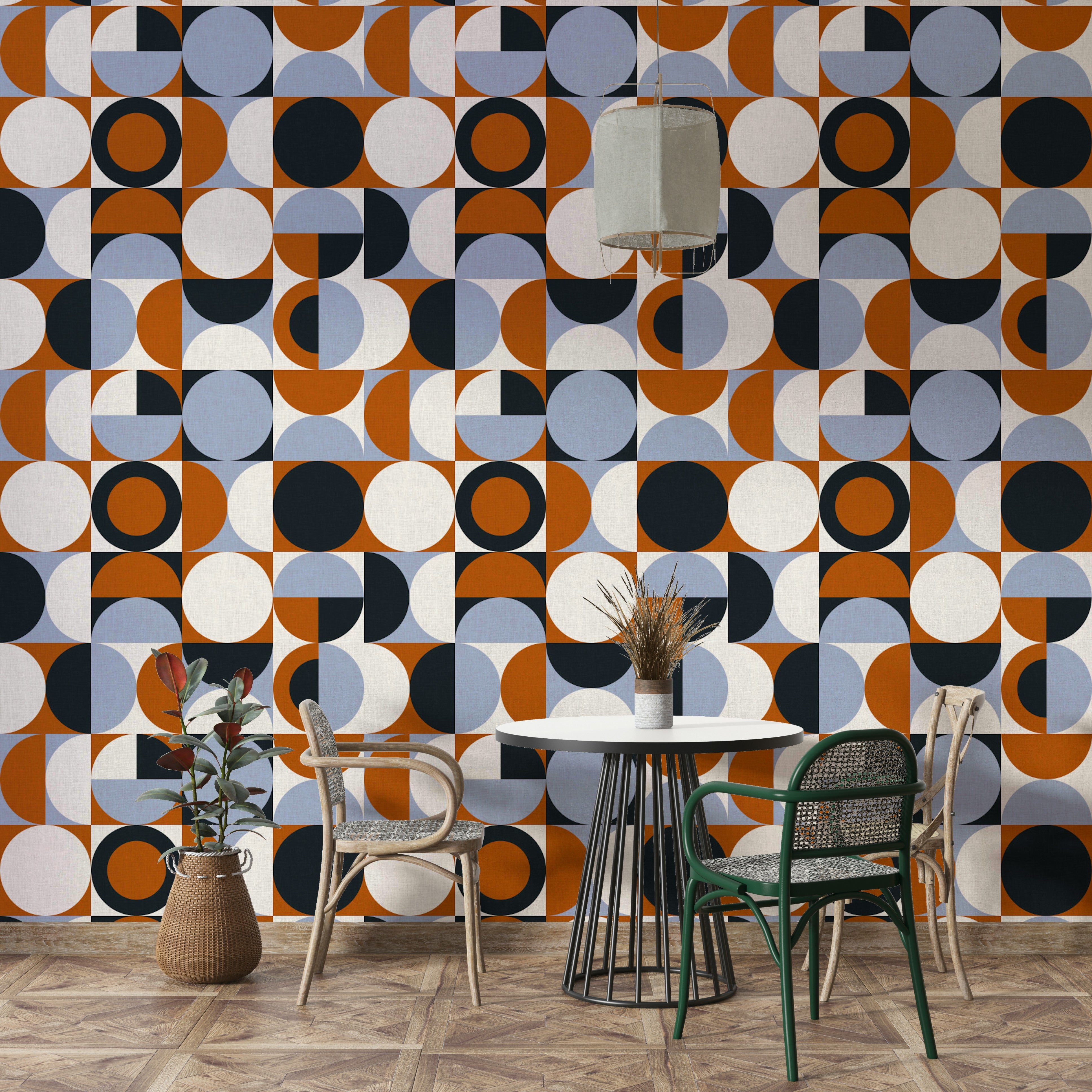 “Mescolanza” embodies a playful yet sophisticated fusion of geometric forms and earthy tones. Circles and squares intertwine in a dynamic dance, creating a visually stimulating wallpaper. The color palette, featuring warm burnt orange, serene pale blue, crisp white, and deep charcoal, evokes a sense of mid-century modern charm. The textured effect adds depth and dimension, suggesting the feel of woven fabric. This captivating design is perfect for adding a touch of retro-inspired elegance to any space, offering a balanced blend of boldness and tranquility.