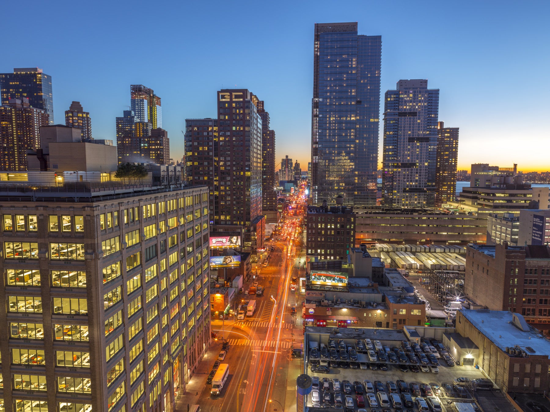 The lights of the city's skyscrapers are just beginning to glow, creating a dramatic contrast.