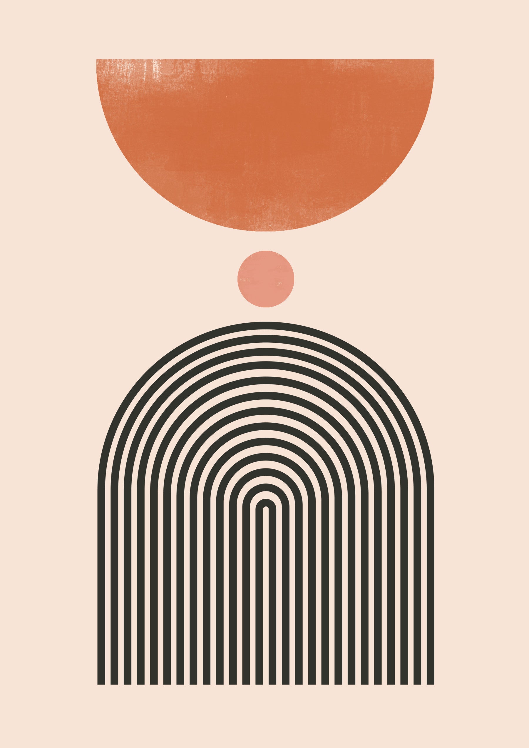 This wallpaper showcases a minimalist mid-century modern design. The interplay of geometric shapes, including a large arch composed of bold black and beige stripes, a textured burnt orange half-circle, and a small peach circle, creates a visually striking and balanced composition. The muted earth tone color palette evokes a sense of calm and sophistication, making it perfect for contemporary interiors. The clean lines and simple forms project a feeling of serenity and understated elegance, suitable for bedrooms, living rooms, or home offices seeking a tranquil atmosphere.