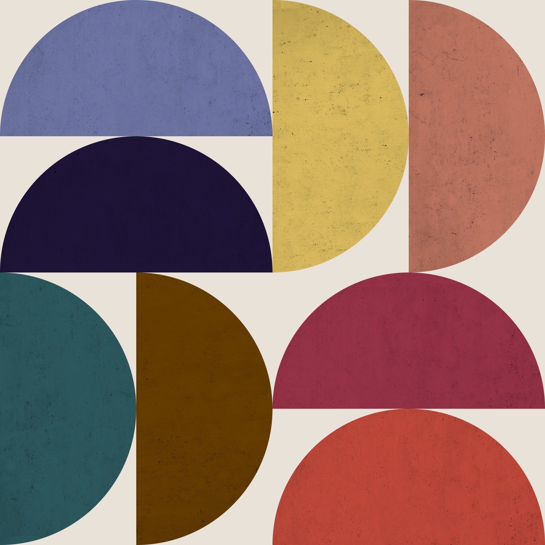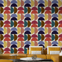 Embrace mid-century modern style with this geometric wallpaper. The design uses a mosaic of semi-circles in a rich palette of muted colors, including earthy browns, dusty rose, muted teal and soft yellows. The slightly textured effect gives the wallpaper a tactile feel, adding depth to the clean lines and simple shapes. It's a sophisticated choice for a living room, bedroom, or hallway, easily blending with both contemporary and traditional furniture styles. The subtle color scheme creates a sense of calm and quiet sophistication, perfect for spaces where you want to relax and unwind.
